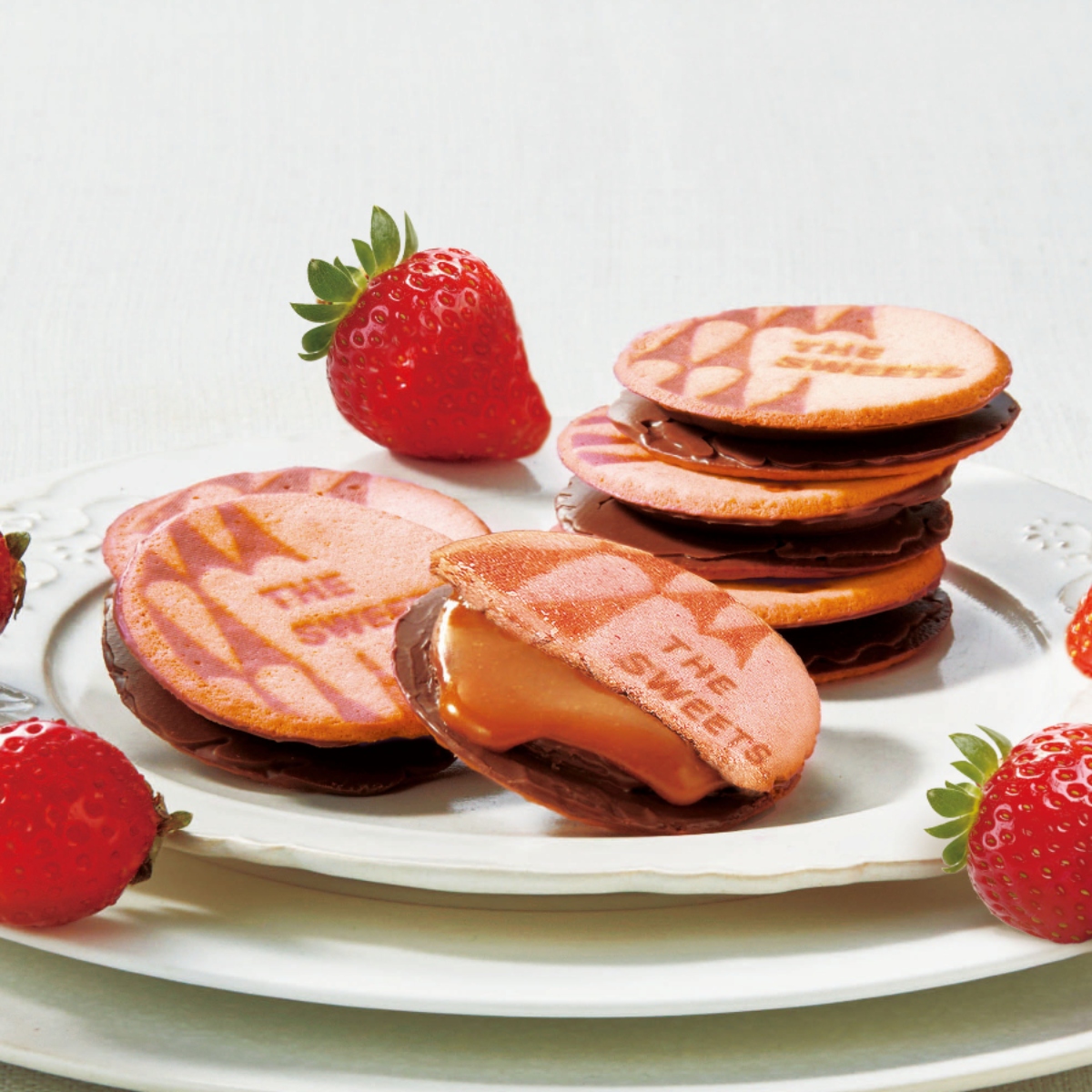 ひと口かじれば、サクッと軽やかなラングドシャの食感。生地に贅沢に練り込まれた「あまおう苺」が、豊かな香りと爽やかな酸味を届けます。中からとろけ出す濃厚なキャラメルと口どけの良いチョコレートが重なり合い、贅沢な味わいのハーモニーを奏でます。