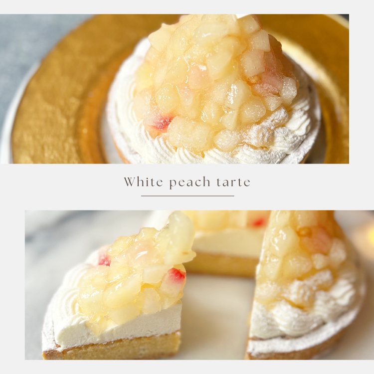 桃色が混じる白桃だけを、贅沢にデコレーションしました。 ホワイトと淡い桃色のグラデーションが美しい、手仕事で丁寧に作るおいしさをぜひお召し上がりください。