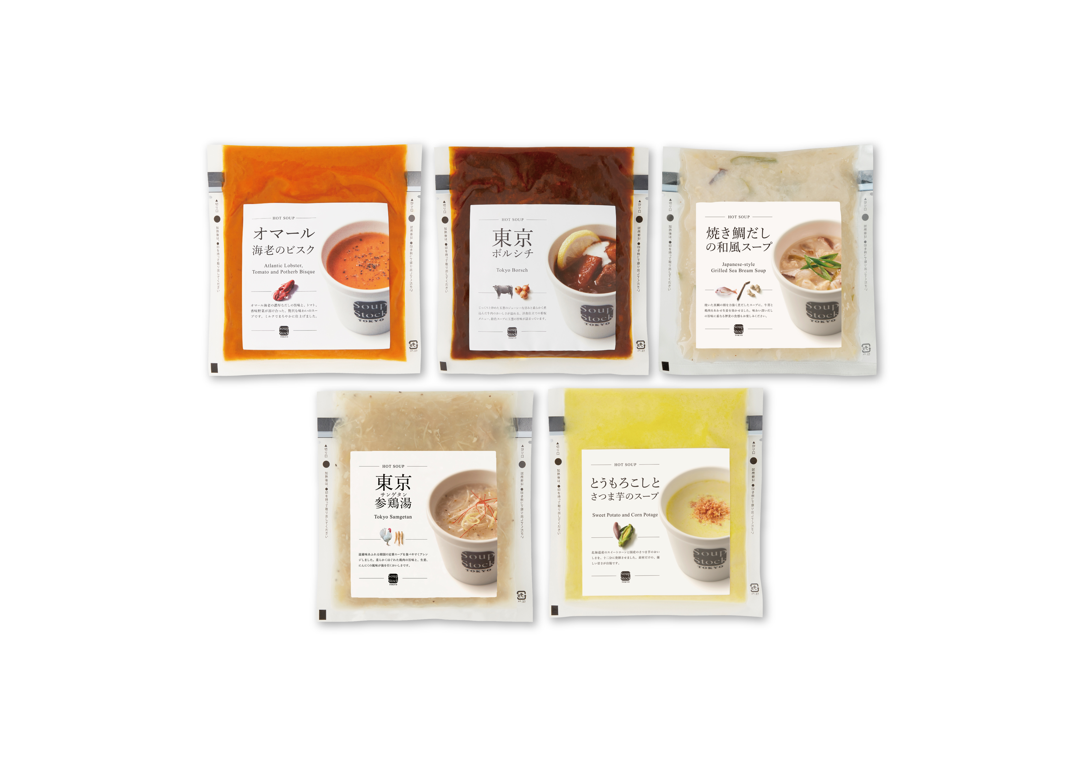 | 原材料 | 【オマール海老のビスク】 野菜(玉葱、人参、セロリ、にんにく)、オマール海老ブイヨン〔オマールエビヘッド、野菜(玉葱、人参、セロリ、にんにく、パセリ)、トマトペースト、ワイン、トマト・ピューレーづけ、ブランデー、オリーブ油、大豆油、酢漬けタラゴン、食塩、香辛料〕(国内製造)、牛乳、クリーム、トマトペースト、ワイン、澱粉、ホタテブイヨン、バター、豚脂、カニブイヨン、食塩、はちみつ、ブランデー、香辛料、(一部に乳成分・えび・かに・大豆・豚肉を含む) 【東京ボルシチ】ソテー野菜〔野菜(玉葱、人参、セロリ、にんにく)、牛脂、菜種油〕(国内製造)、牛肉、トマトペースト、ビーフエキス、チキンブイヨン、食塩、醤油、香辛料 / カラメル色素、(一部に小麦・牛肉・大豆・鶏肉を含む) 【とうもろこしとさつま芋のスープ】牛乳(国内製造)、コーンペースト、さつま芋、クリーム、ソテーオニオン(玉葱、菜種油)、食塩、澱粉、香辛料、(一部に乳成分・大豆を含む) 【焼き鯛だしの和風スープ】野菜(大根(国産)、ごぼう、ねぎ、生姜)、ブイヨン(真鯛頭、清酒、根昆布だし、その他)、押麦、鶏肉、魚醤加工品(魚醤、昆布エキス、食塩、酵母エキス)、クリーム、醤油、片栗粉、豚脂、食塩、乾しいたけ、香辛料、(一部に乳成分・小麦・大豆・鶏肉・豚肉を含む) 【東京参鶏湯】 鶏肉(ブラジル)、もち米、野菜(太葱、にんにく、生姜)、チキンブイヨン、食塩、香辛料、高麗人参、(一部に鶏肉を含む) |