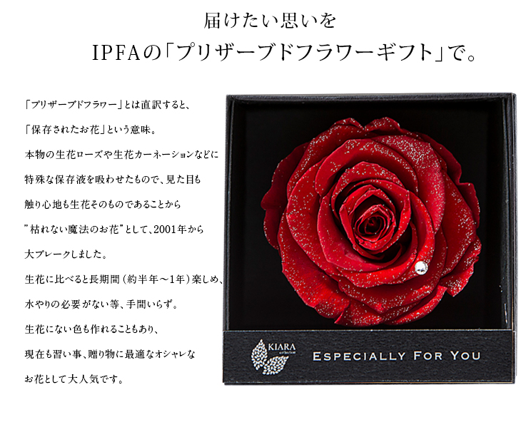 大口注文・法人のお問い合わせはこちらプリザーブドフラワーは生のお花を保存加工したお花のため、生花そのものの質感がお楽しみいただけるお花です。水やりの必要がなく、長時間(半年~1年)は充分綺麗な状態で楽しめるため、誕生日ギフトや母の日ギフト等、贈り物としてご利用いただくことが多いお花です。花粉も飛ばないため、お見舞いとしてもご利用いただけます。メッセージカードと合わせ電報代わりにご利用いただく方も多く、様々なシーンでご利用いただけます。贈り物には最適なお花です。