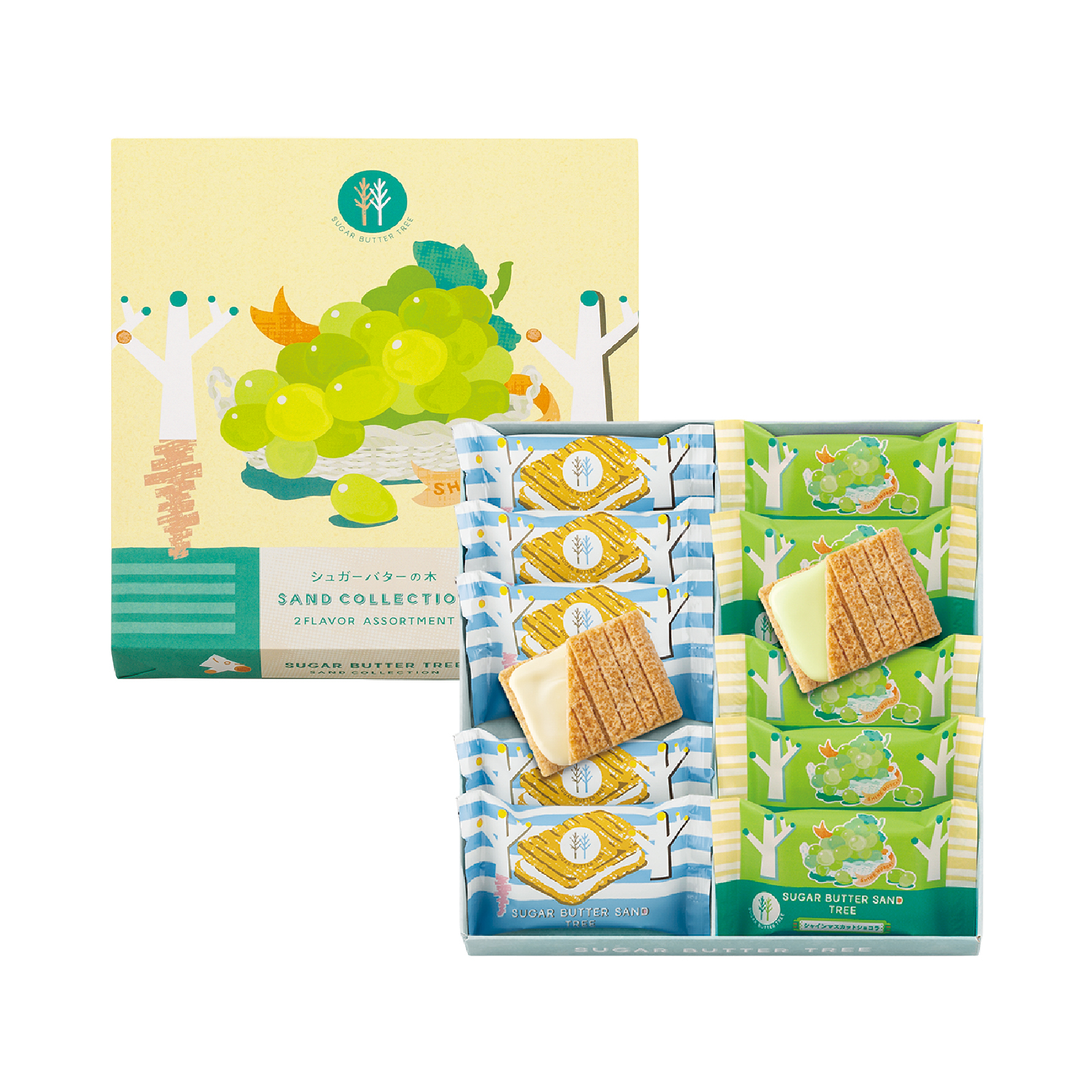 大口注文・法人のお問い合わせはこちらシリーズ一番人気の「シュガーバターサンドの木」に、季節限定の「シャインマスカットショコラ」をセットにしたひと箱。季節の味わいも定番も食べ比べてみたい方におすすめの詰合せです。