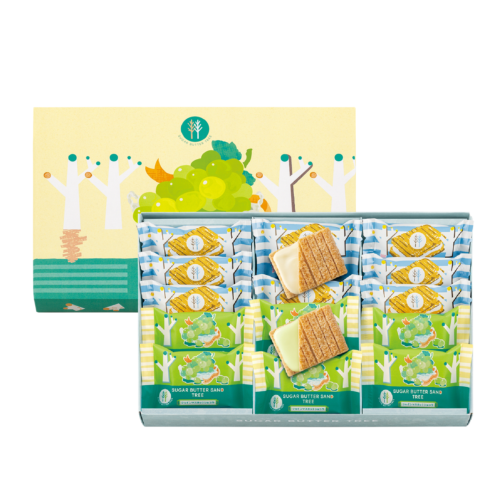 大口注文・法人のお問い合わせはこちらシリーズ一番人気の「シュガーバターサンドの木」に、季節限定の「シャインマスカットショコラ」をセットにしたひと箱。季節の味わいも定番も食べ比べてみたい方におすすめの詰合せです。