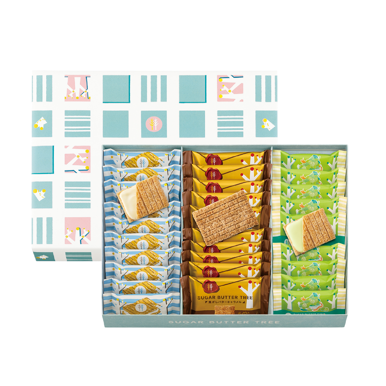 | 内容量/数量 | ・シュガーバターサンドの木11個 ・シュガーバターサンドの木 シャインマスカットショコラ10個 ・シュガーバターの木 焦がしバターキャラメル11枚 |
