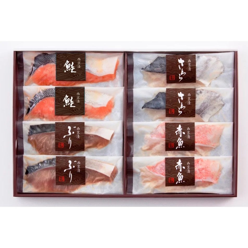 | 内容量/数量 | 鮭・ぶり・赤魚・さわら西京漬 各60g×2切 |