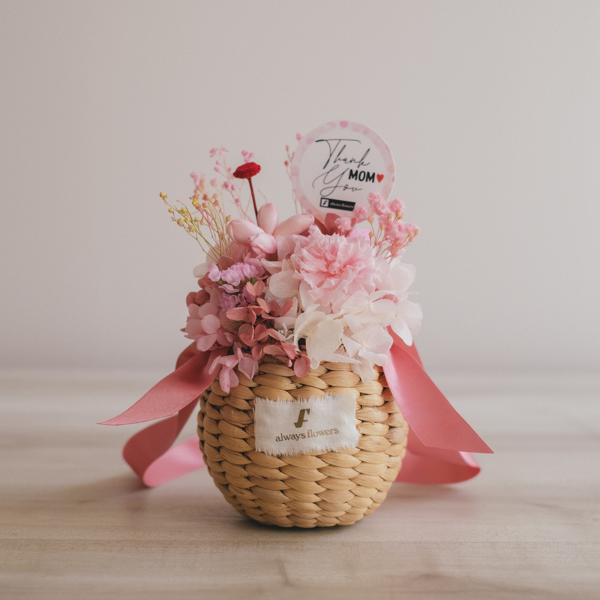 プリザーブドフラワーやドライフラワーを使用しているため、水やりなどのお手入れは一切不要です。 いつまでも色褪せない美しい花々が、お母さんの毎日に彩りと癒しを添え続ける、とっておきの贈り物に。 年に一度の母の日。普段は照れくさくて言えない「ありがとう」の気持ちを、愛らしいフラワーギフトに託してみませんか。
