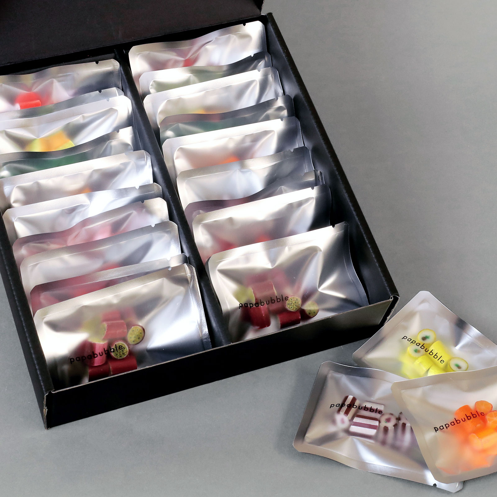 大口注文・法人のお問い合わせはこちら黒を基調としたシックなBOXに、大きくロゴをあしらったシンプルで洗練されたデザイン。 中には、パパブブレらしいカラフルで美しいキャンディやグミが詰め込まれています。 これからの季節、パーティーの手土産や贈りものにもぴったりのコレクションです。