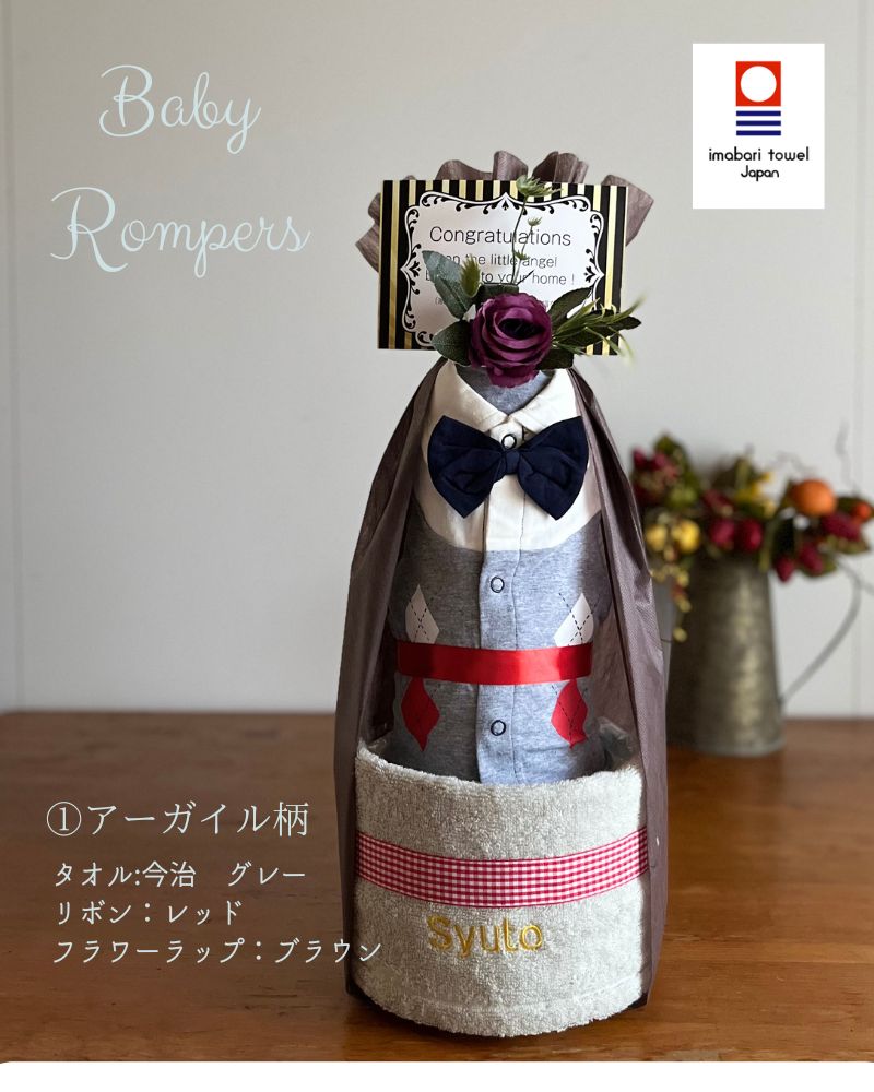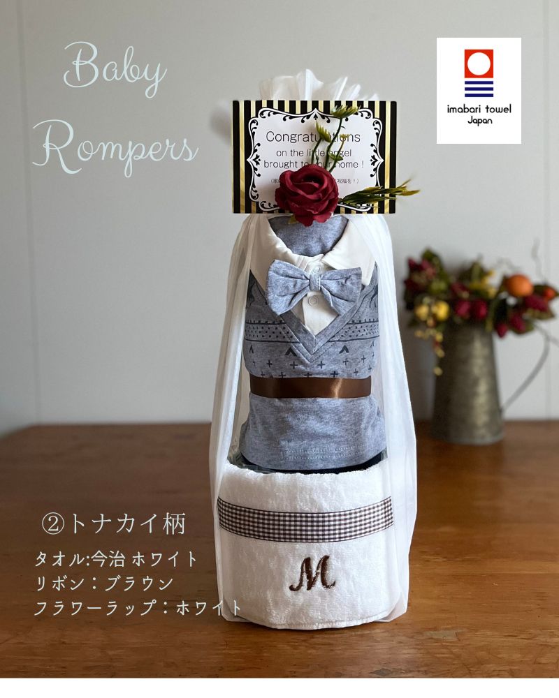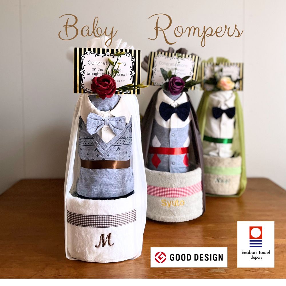 フォーマルにも使える蝶ネクタイの付いたロンパースのおむつケーキ。男の子の出産祝いや端午の節句にもおすすめです。名入れタオルで世界にたったひとつの贈り物にいかがでしょうか。