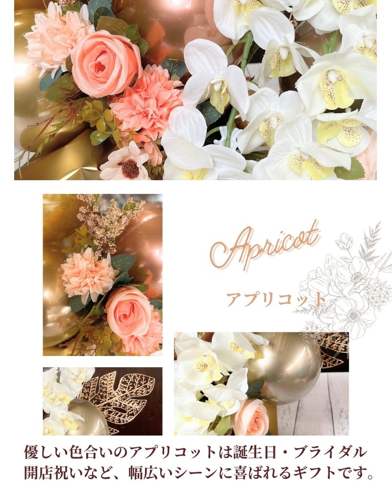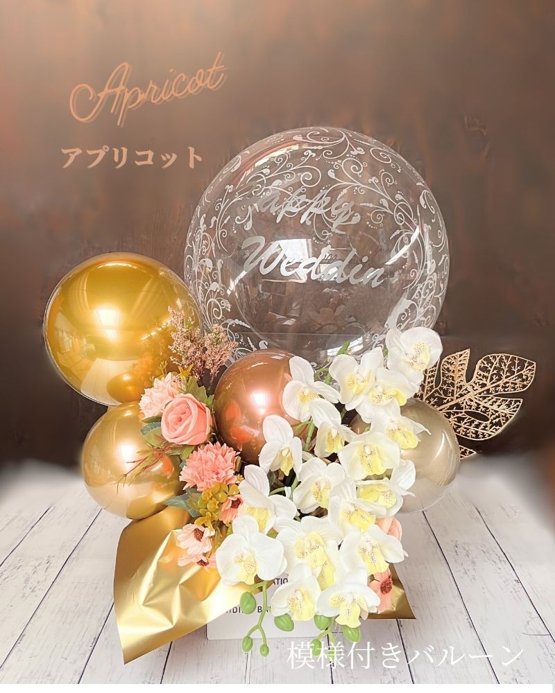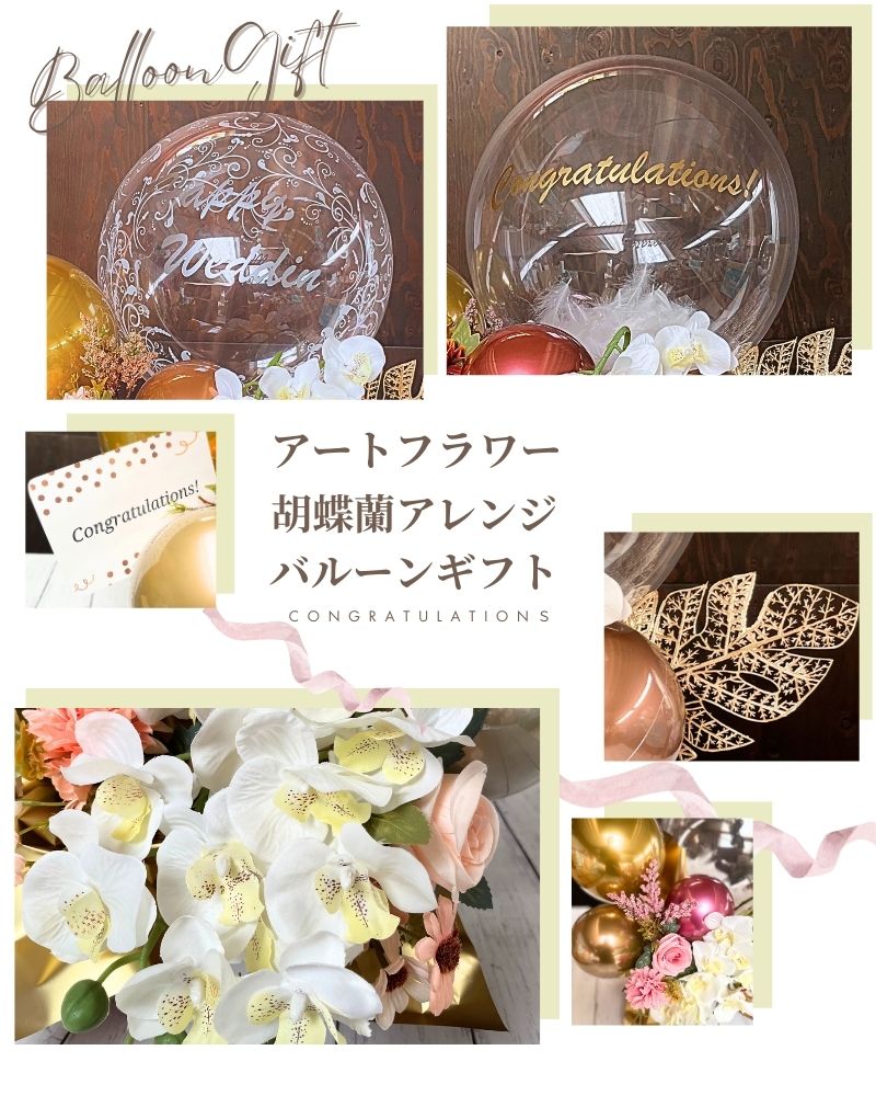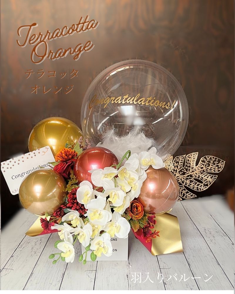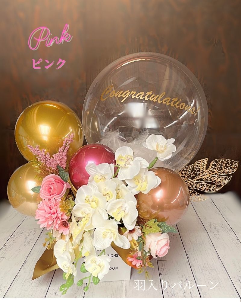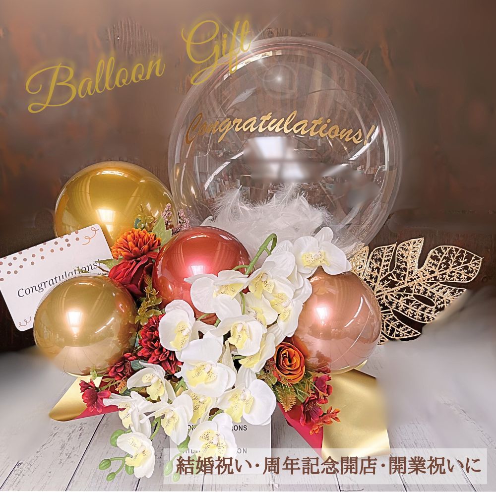 胡蝶蘭を使用した両手いっぱいサイズの豪華なバルーンギフト。模様付きバルーンと羽入りバルーンをご用意しました。枯れないアートフラワーなので、水やり不要でお手入れいらず。誕生日やブライダル、開店祝いなど幅広いシーンに喜ばれます。
