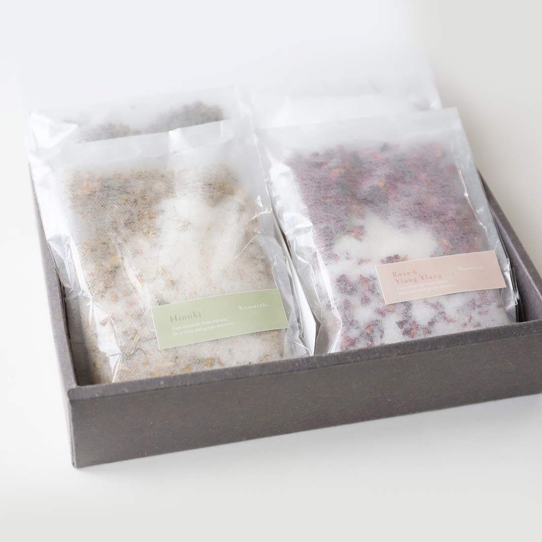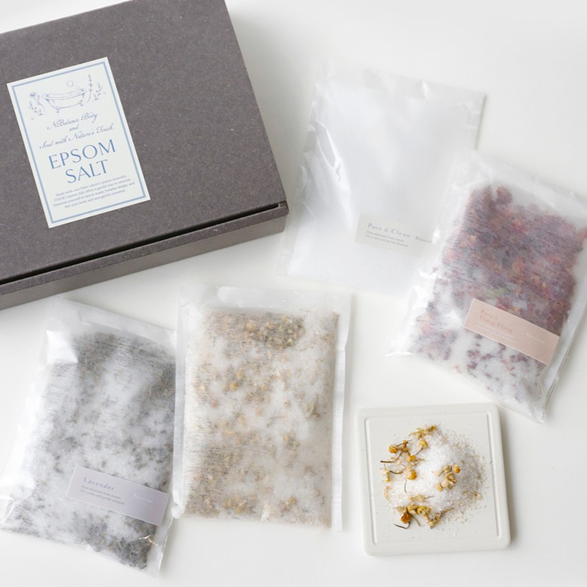 ラベンダー・ひのき・イランイラン、そして無香料の4タイプを詰め合わせたセットです。アロマの香りを添えたエプソムソルトに、華やかなドライハーブを組み合わせた仕様。お湯に溶かすだけで、香りがふわりと広がり、いつものお風呂が少し特別な時間に変わります。