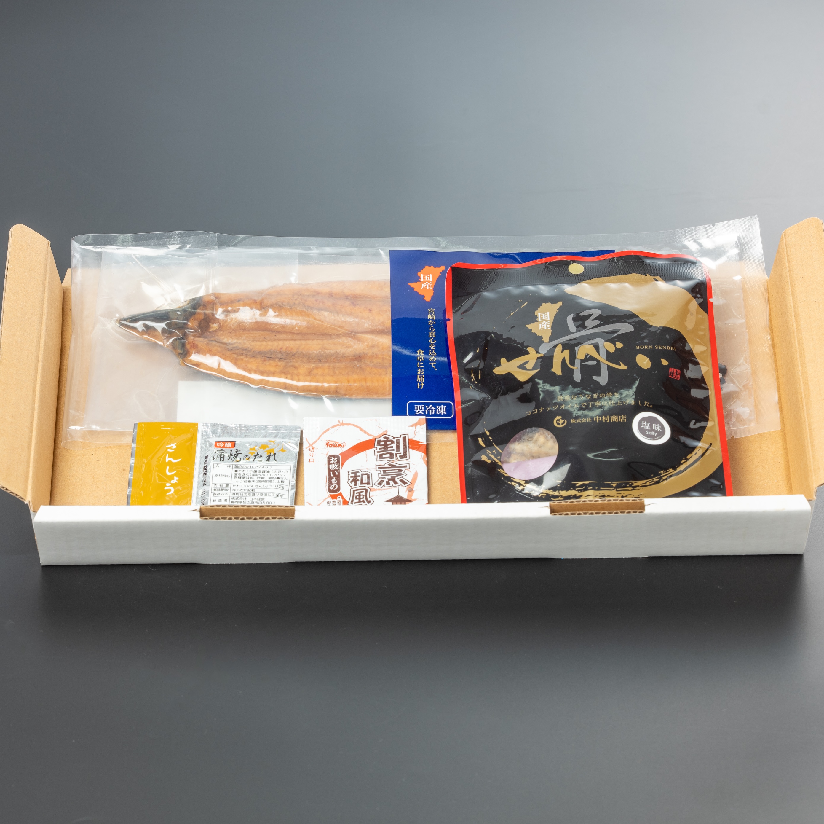 | 原材料 | 〈蒲焼〉 国産うなぎ、本醸造醤油(大豆、小麦を含む)、水あめ、発酵調味料、砂糖混合ぶどう糖果糖液糖、みりん、砂糖、澱粉 〈骨せんべい塩味〉 国産うなぎ骨、有機ココナッツオイル、海塩(宮崎県産) 〈たれ〉 本醸造醤油 [大豆・小麦を含む] (国内製造)、みりん、発酵調味料、砂糖、澱粉 〈さんしょう〉 山椒(国産)花椒 〈お吸物〉 食塩、粉末醤油(小麦・大豆を含む)、えび粉末、鰹節粉末、椎茸粉末、昆布粉末、食用植物油脂、香辛料、うきみ・具(わかめ、ごま、ねぎ)/調味料(アミノ酸等) |