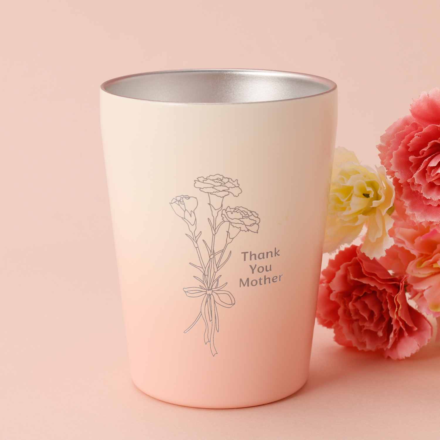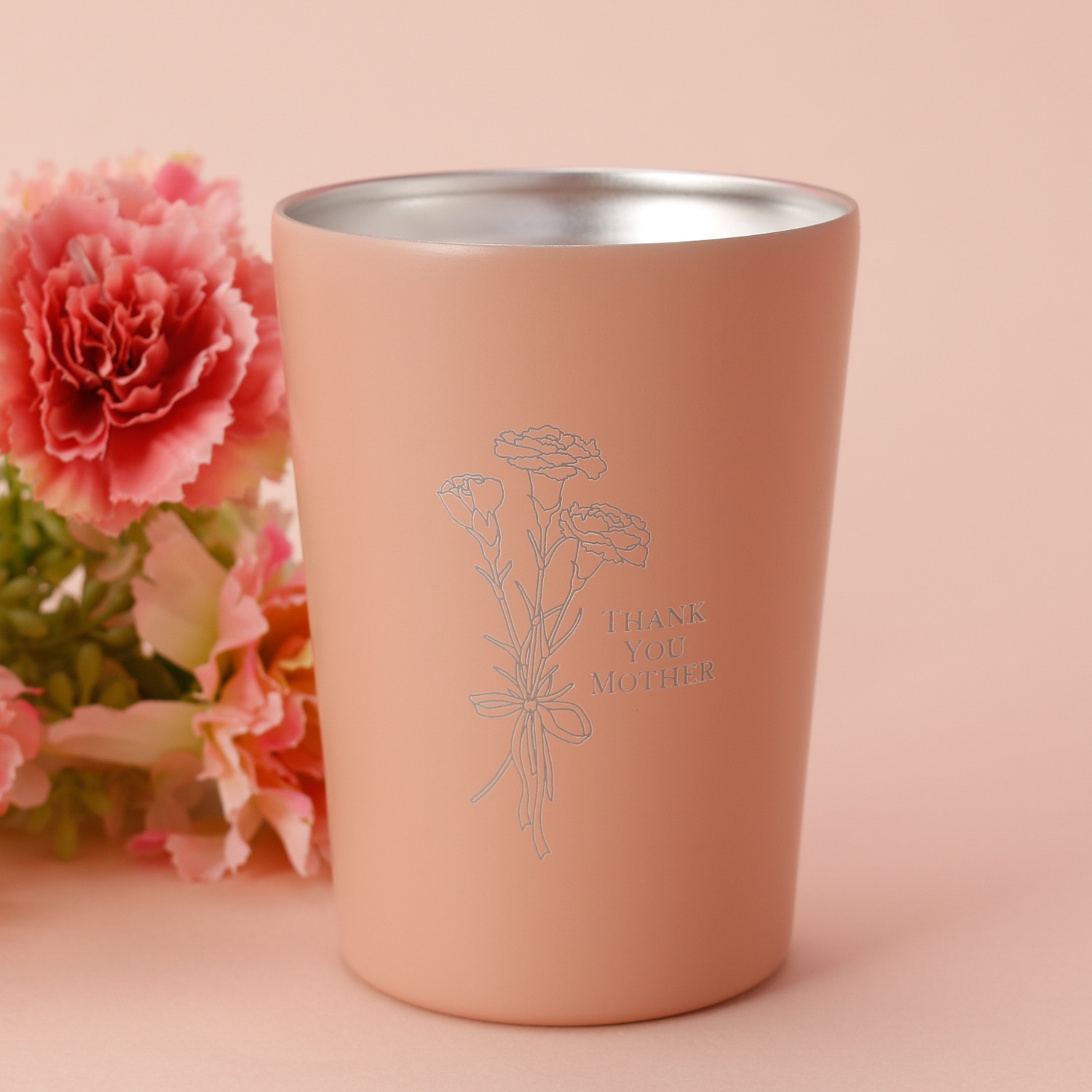 大口注文・法人のお問い合わせはこちら大切なお母さんに、日頃の感謝を素直に伝えられる母の日限定のタンブラーが登場。 やわらかなカラーのタンブラーに、可憐なカーネーションの線画と「THANK YOU MOTHER」の文字を刻印。 目に入るたび、あたたかな気持ちがよみがえる特別なデザインです。 ステンレス製で保温性もあり、温かい飲み物をゆっくり楽しめるのも嬉しいポイント。 使いやすい330ml~380mlのサイズで、日常使いにもぴったり。 見た目だけでなく、機能性もしっかり兼ね備えた、心も身体もほっとするギフトです。