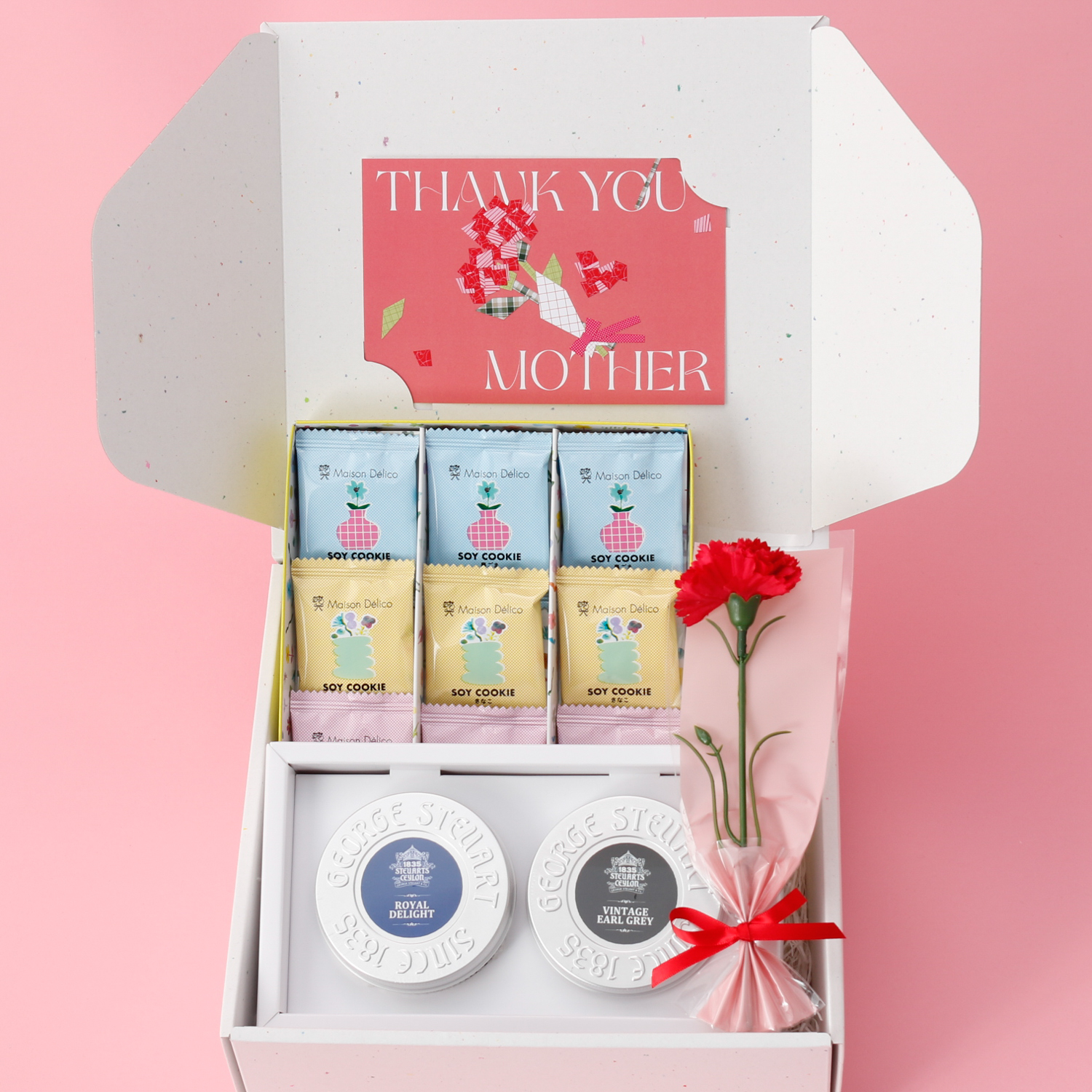 カーネーション、100%国産大豆の「生おから」を使ったシンプルでやさしい甘さのクッキー、2種より選べる紅茶をセットにしました。専用のギフトBOXに入れてお届けいたします。毎日頑張るお母様へ、ギフトと一緒に日頃の感謝の気持ちを伝えてみませんか。