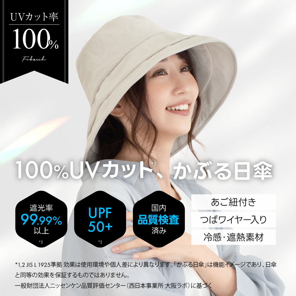 大口注文・法人のお問い合わせはこちら「まるで被る日傘」のように、UVカット率100%・遮光率99.99%以上を実現した高機能UVハット。 高い遮熱性と接触冷感素材で、夏の暑さからも頭部を守ります。 あご紐付きで風の日や自転車も安心。