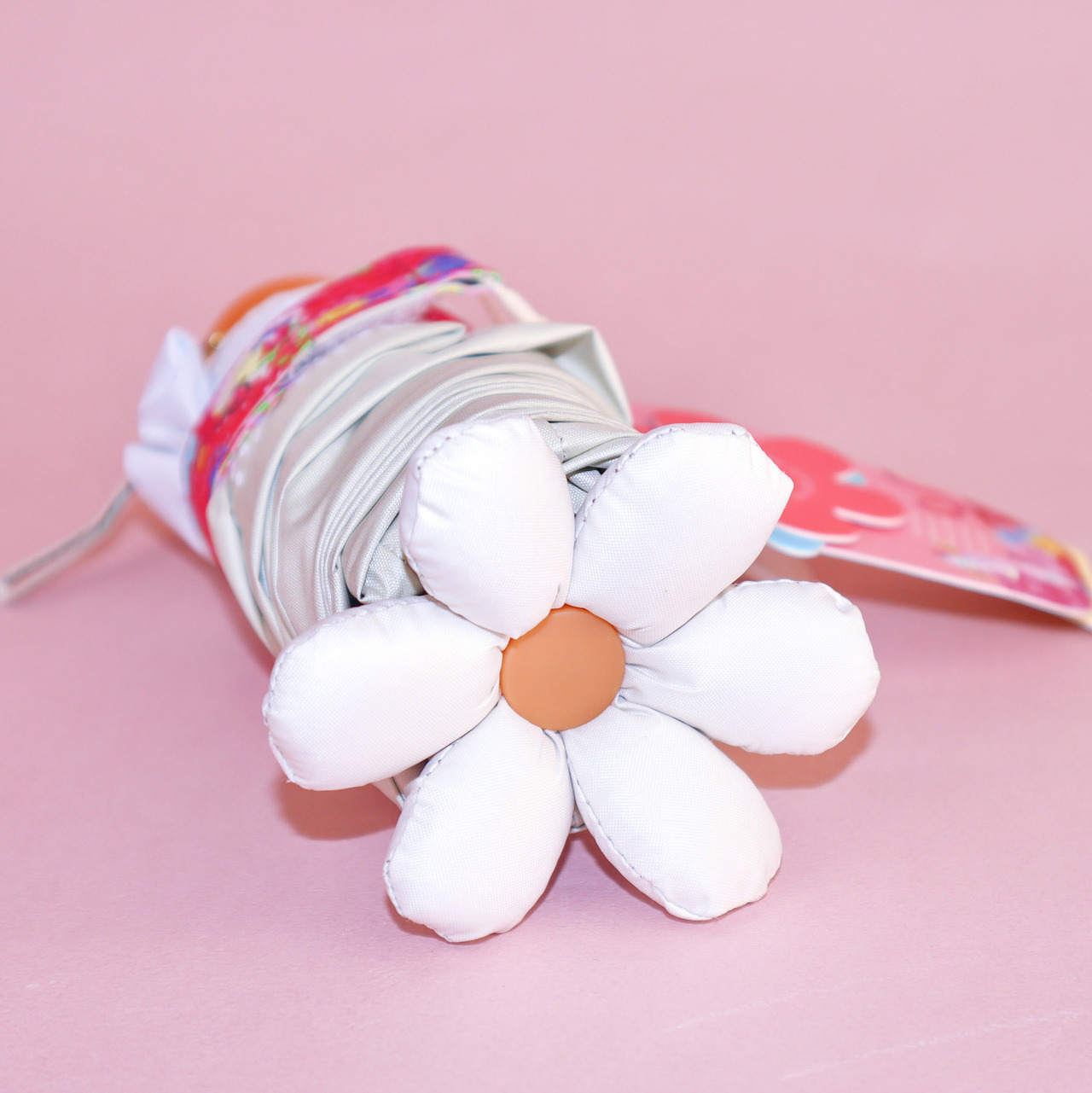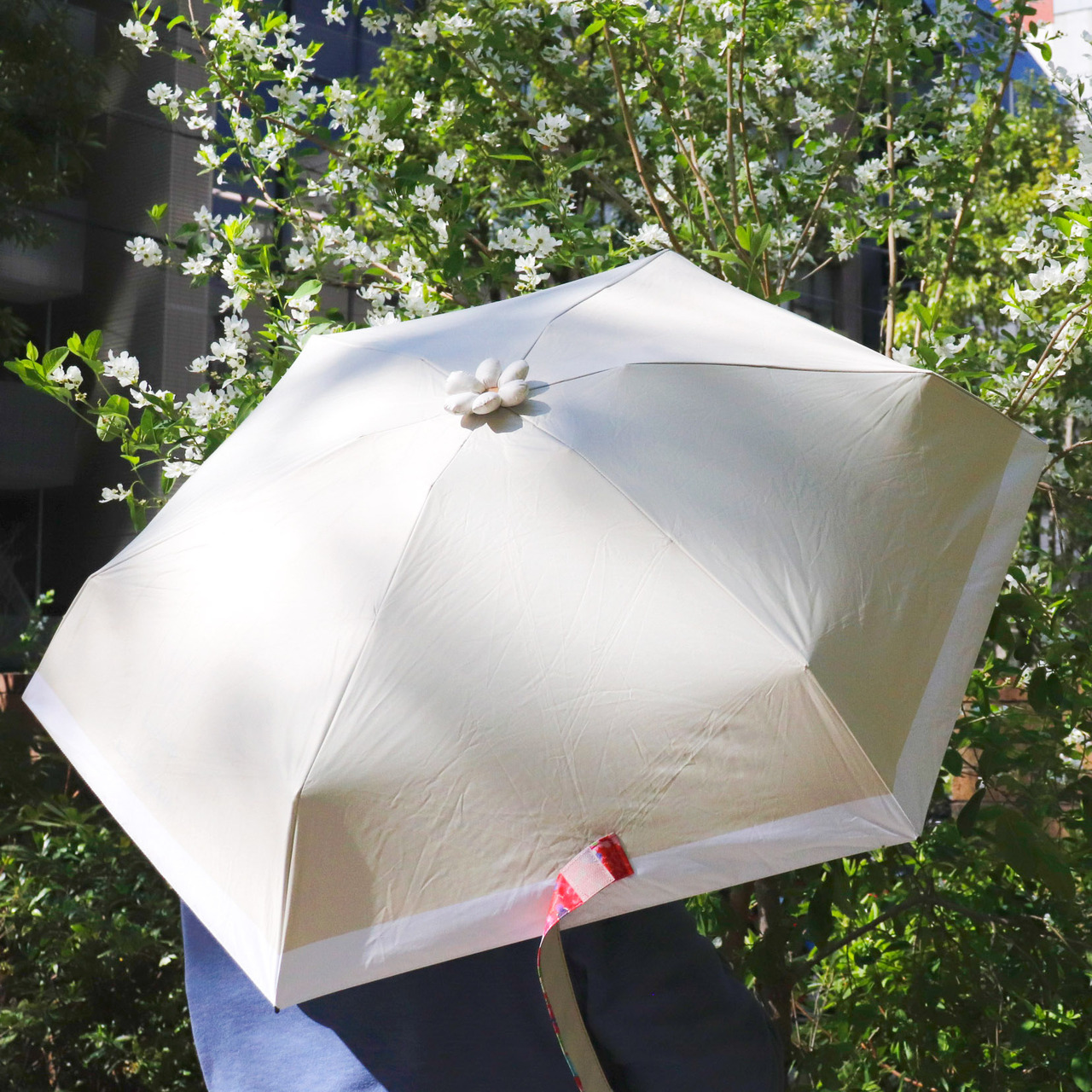 傘は、立体感のあるお花モチーフがアクセントになった、持つだけで気分が上がるデザインの折り畳み傘です。 シンプルな本体に映えるフラワーパーツが上品な可愛らしさを演出します。晴雨兼用タイプなので、突然の雨はもちろん、日差しが気になる日にも活躍。しっかりとした裏地付きで、遮光・遮熱にも配慮した安心のつくりです。 さらに、傘をまとめるストラップ部分にはグラフィックアーティストのホラグチカヨさん描きおろしのkarendo限定デザインを採用し、細部までこだわりをプラス。 数種類のポップでキュートなタグも付属しており、遊び心のあるディテールが魅力です。毎日のお出かけに、ちょっとしたときめきを添えてくれる一本です。
