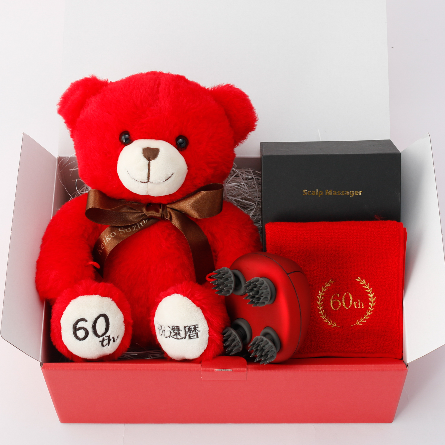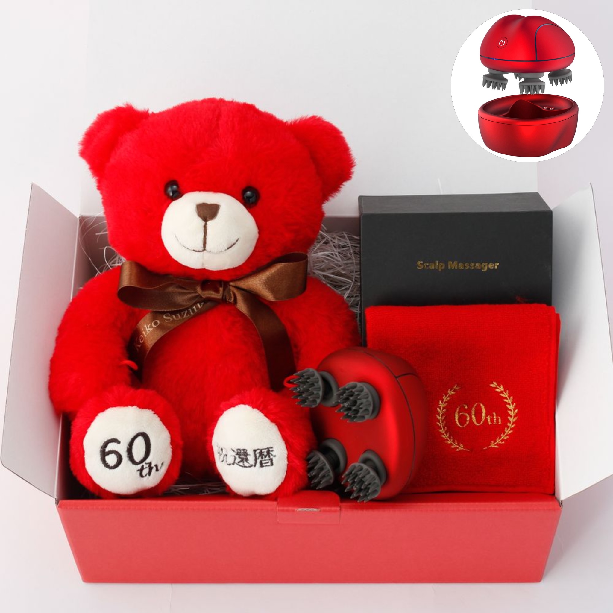 頭皮や全身のマッサージが可能なコンパクトマッサージ器と還暦のお祝いにぴったりな赤いテディベア、還暦刺繍入りの今治ハンドタオルをセットにしました。大切な人の還暦祝いに、癒しの時間を届けるギフトです。