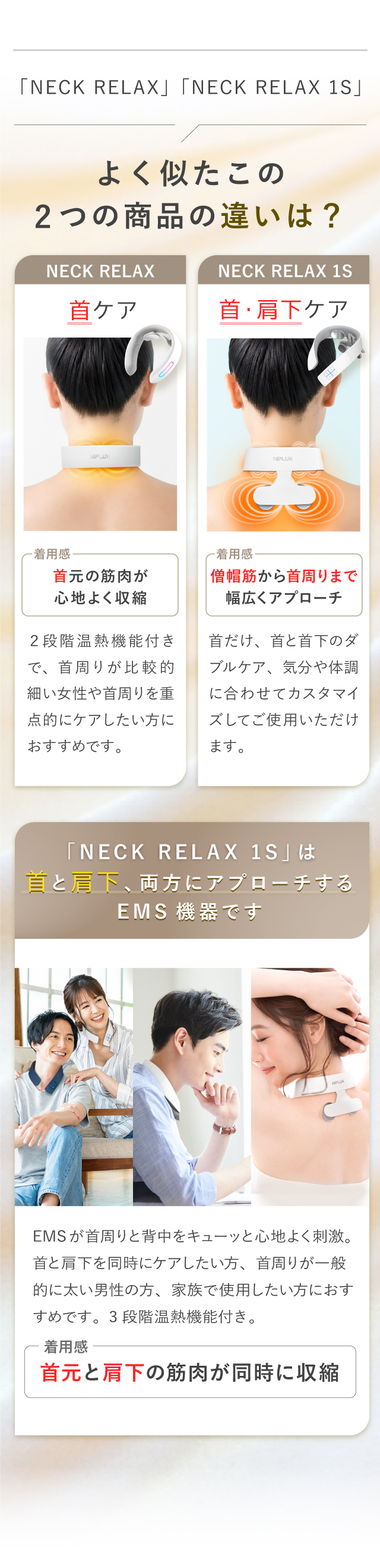 NECK RELAX 1Sは、首や肩の違和感につながる僧帽筋に温熱とEMSでアプローチ!EMSが首周りと背中を心地よく刺激。溜まった違和感も、心地よい温熱とEMSでリラックスできます。 <EMSとは?> EMSとは、Electric(電気)、Muscle(筋肉)、Stimulation(刺激)の頭文字を取ったものです。電気刺激によって筋肉を動かし、違和感にアプローチする技術です。