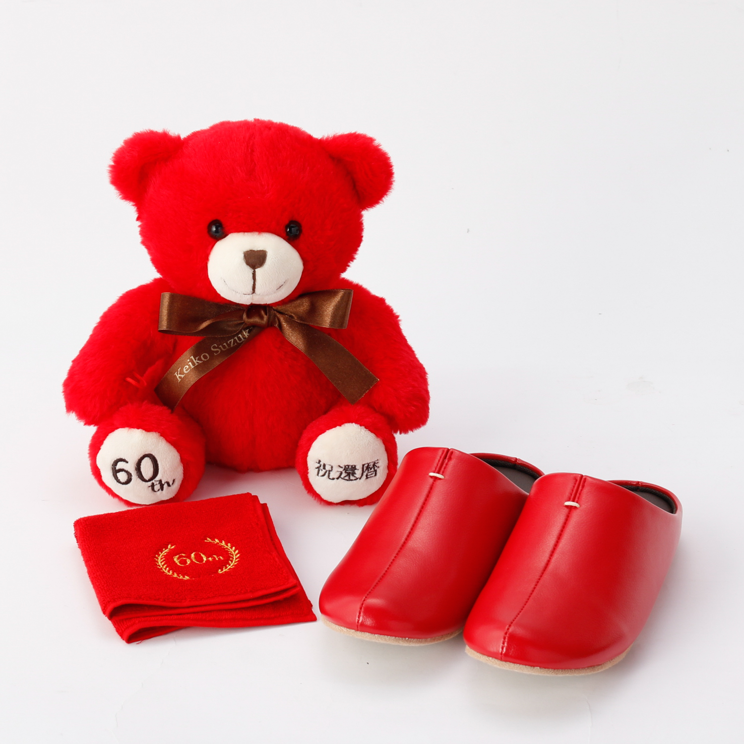 一足ずつ靴型から丁寧に仕上げた、上質な履き心地のスリッパと還暦のお祝いにぴったりな赤いテディベア、還暦刺繍入りの今治ハンドタオルのセットです。スリッパはシンプルでユニセックスなデザインが魅力的。豊富なカラーと2種類のサイズからお選びいただけます。