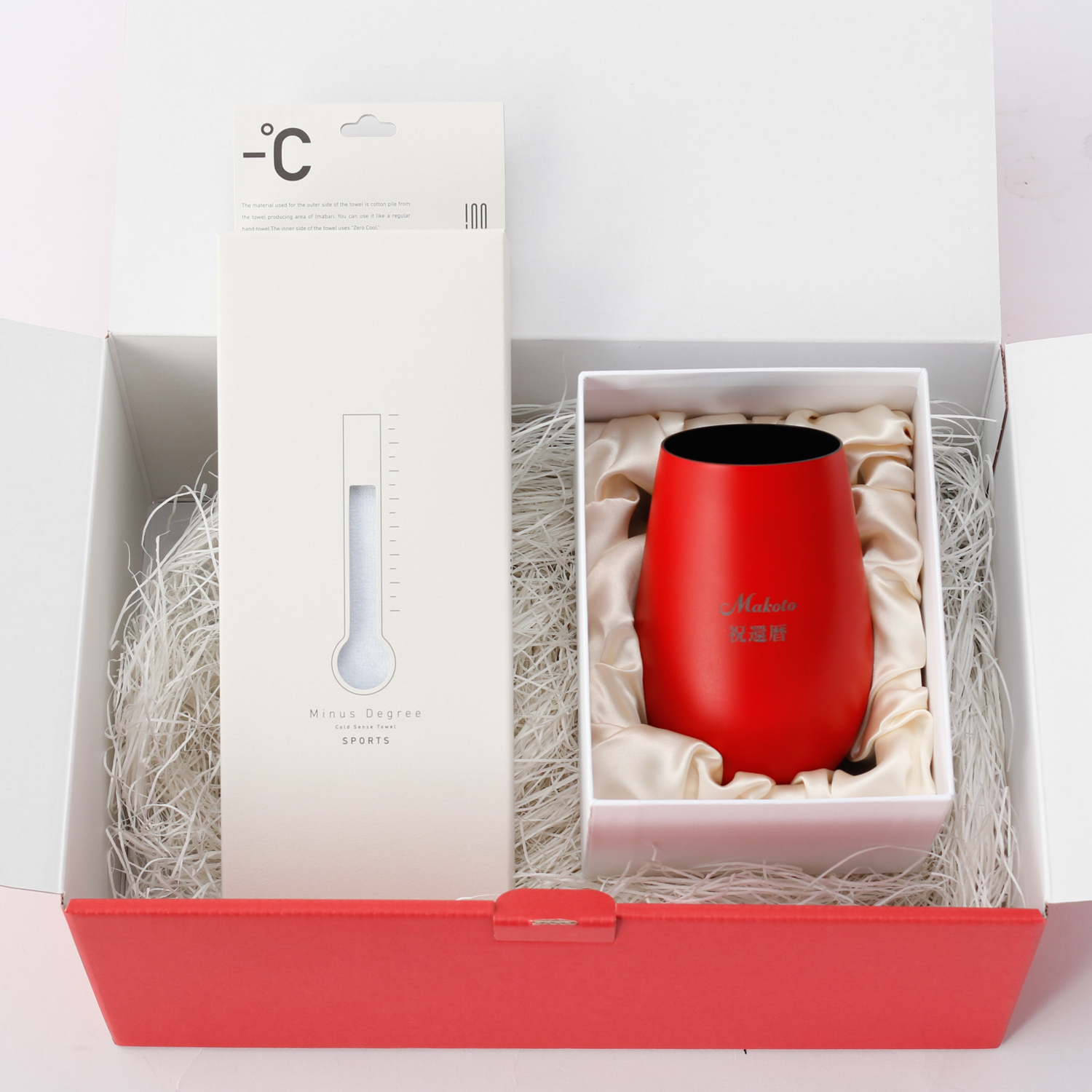 お名前・「祝還暦」を刻印したメタルタンブラーと名入れができる接触冷感タオルのセットです。お名前入りの特別なタオルは、汗ばむ季節やアクティブな場面でも、頼れる一枚。還暦を祝う特別なギフトにおすすめです。