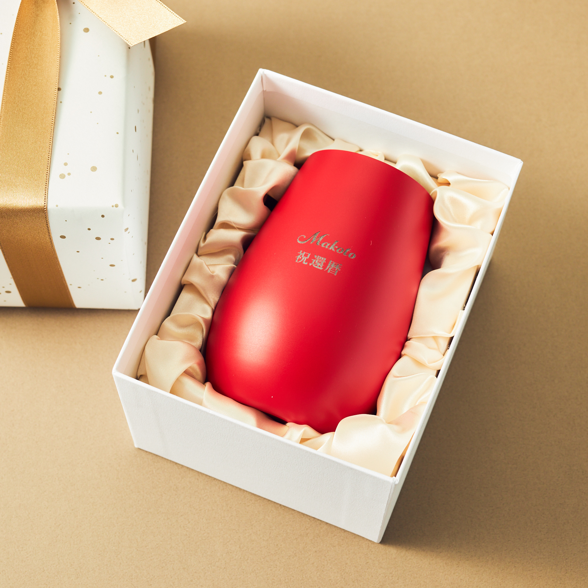 まるで金属製のようなマット塗装がポイントの「メタルカラータンブラー」。 還暦祝いとして喜ばれる真っ赤なタンブラーをご用意しました。 お祝いの気持ちを込めた「祝還暦」のメッセージと、 お相手のお名前を刻印しているので、世界で一つだけのプレゼントに。 丸みを帯びたデザインがおしゃれで、 マット塗装で持った時の手触りが良く、愛着が持てるタンブラーになっています。 お酒をよく飲むお父様へ、華やかなアイテムが好きなお母様へ、 還暦を迎えるお相手様にぴったりなプレゼントです。