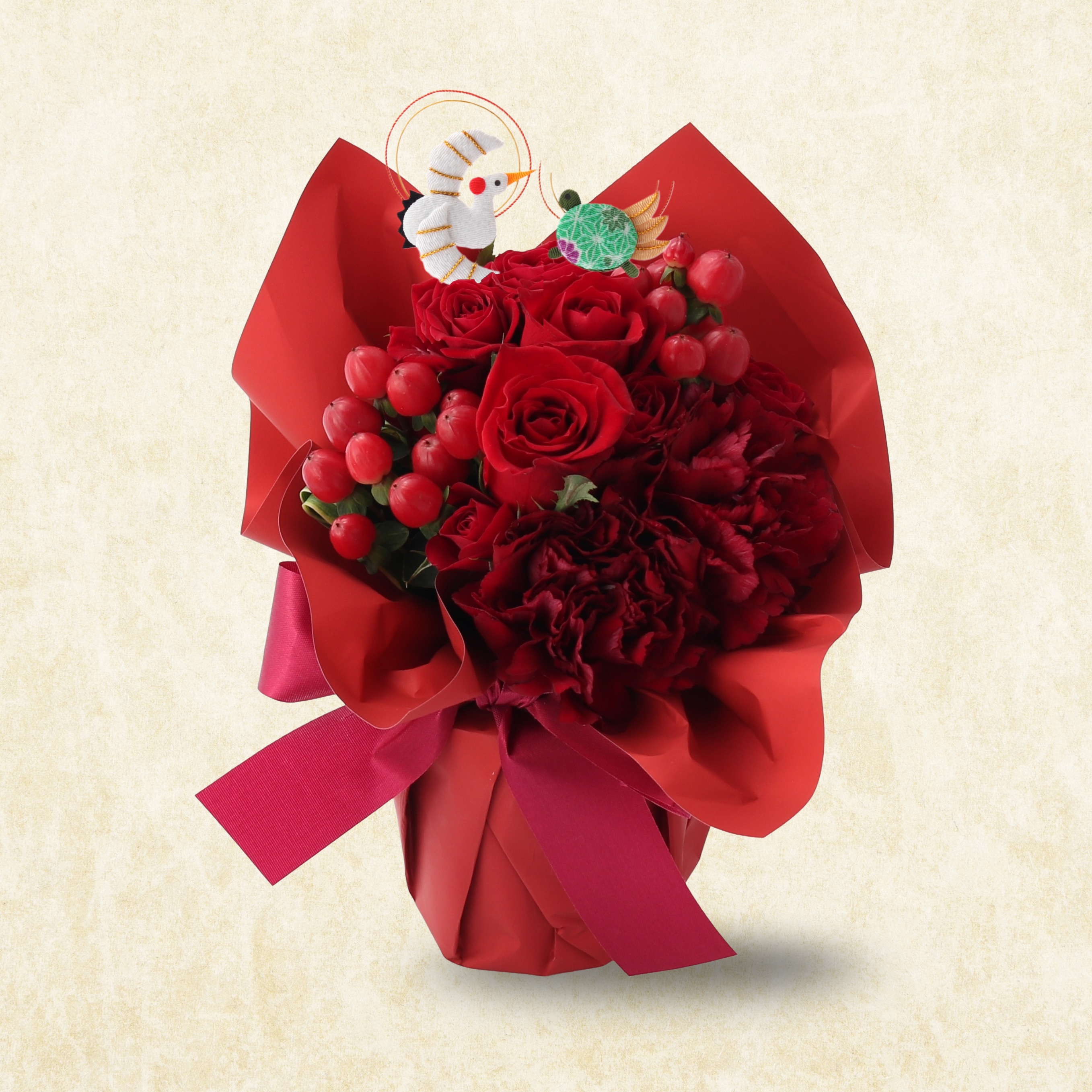 還暦祝いにふさわしい、可愛らしい鶴と亀のピックを添えました。 ちりめん生地に水引をあしらった、和のぬくもりを感じる縁起の良いピックです。