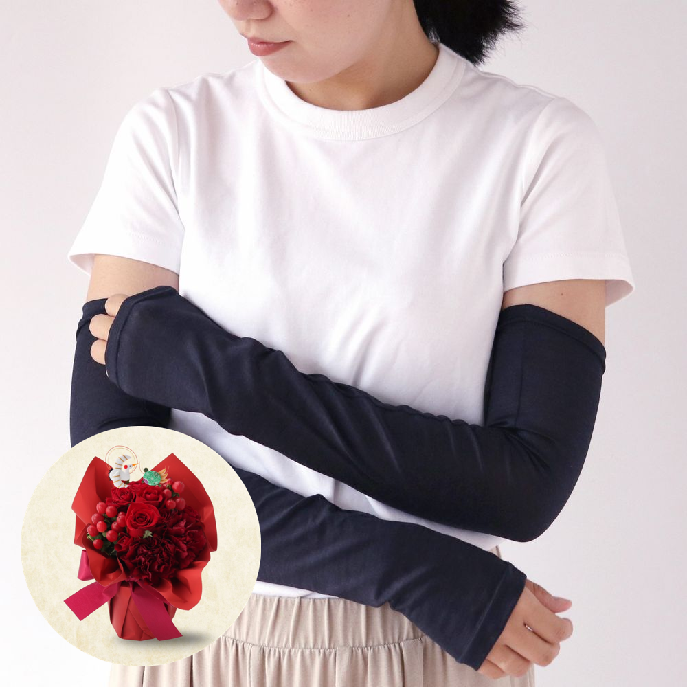 「絹屋」のシルク95%でひんやり冷たいアームカバーと還暦祝いにふさわしい鶴亀の可愛らしいピックがついた生花とのスタンディングブーケをセットにしました。夏に還暦を迎える方への特別なギフトにおすすめです。