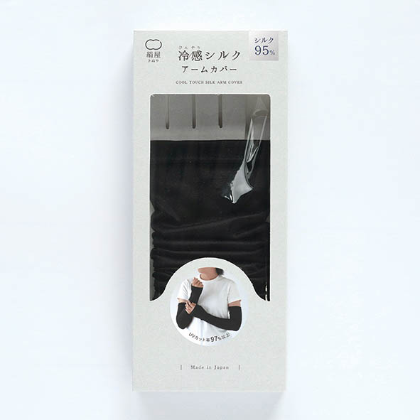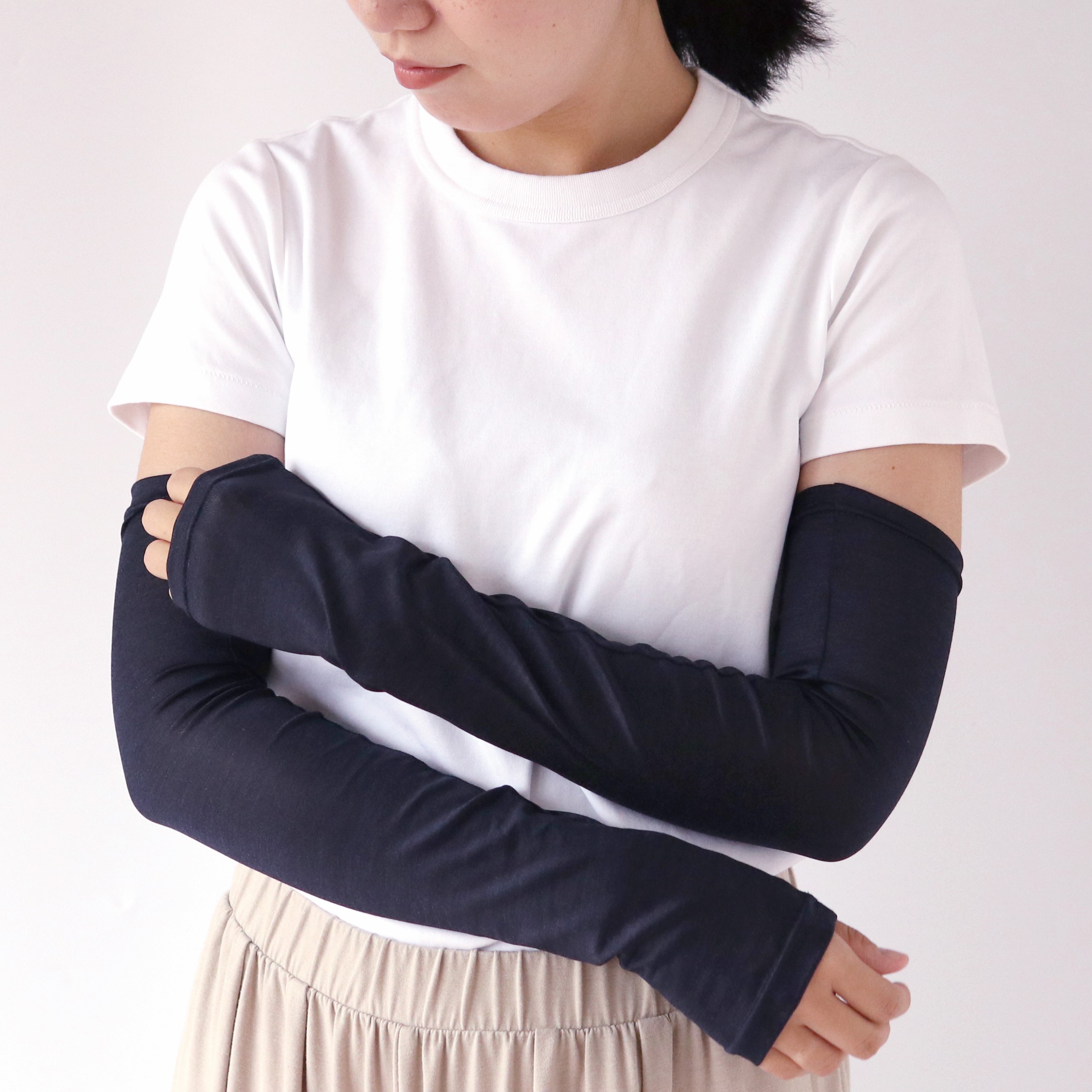 ひんやり接触冷感シルク製アームカバー。触れると冷たく、上品な光沢となめらかな肌触り。ロング丈で手の甲までしっかり紫外線から守るデザインです。