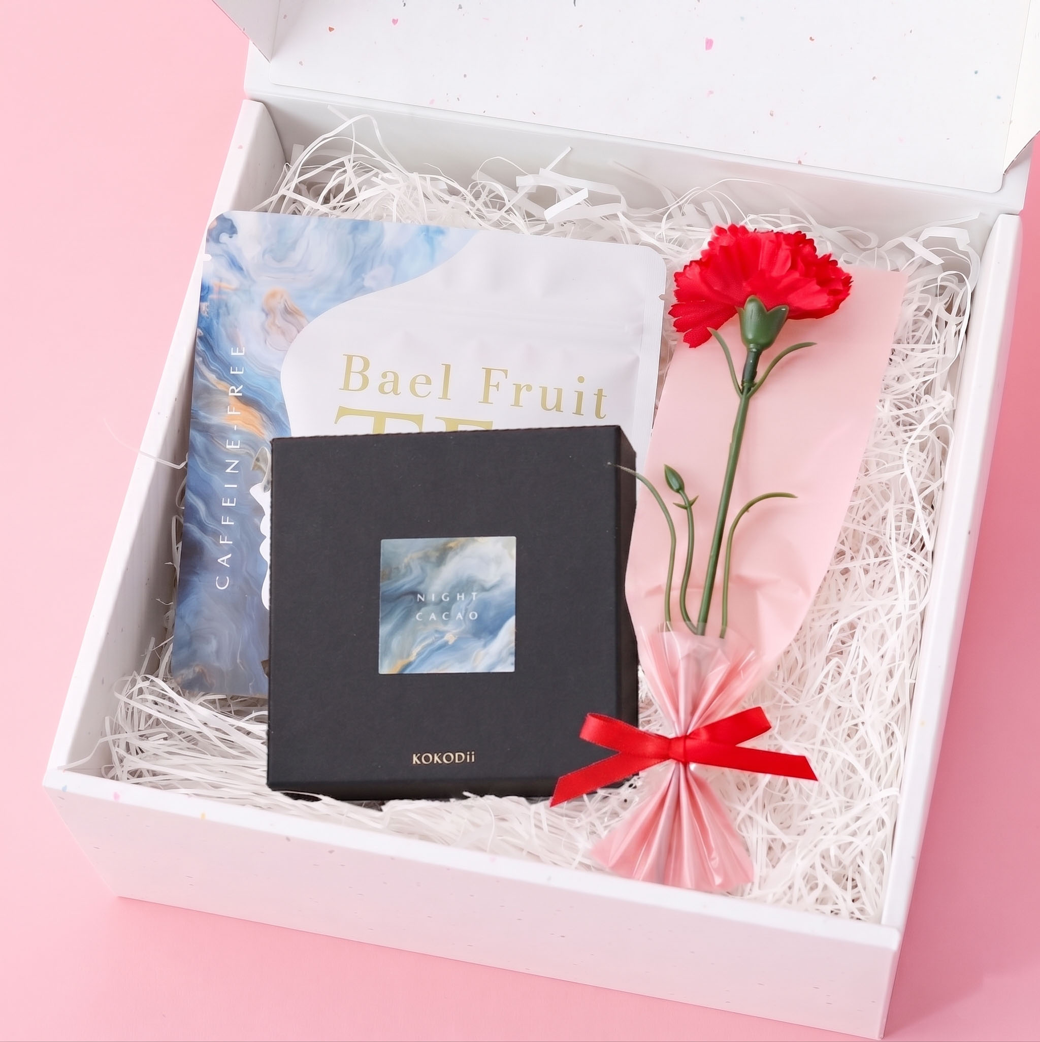 カーネーション、専用のギフトBOXにカーネーションと、濃厚で滑らかな味わいが特徴のタブレットチョコレート、ベールフルーツを使用したハーブティーをセットにしてお届けいたします。