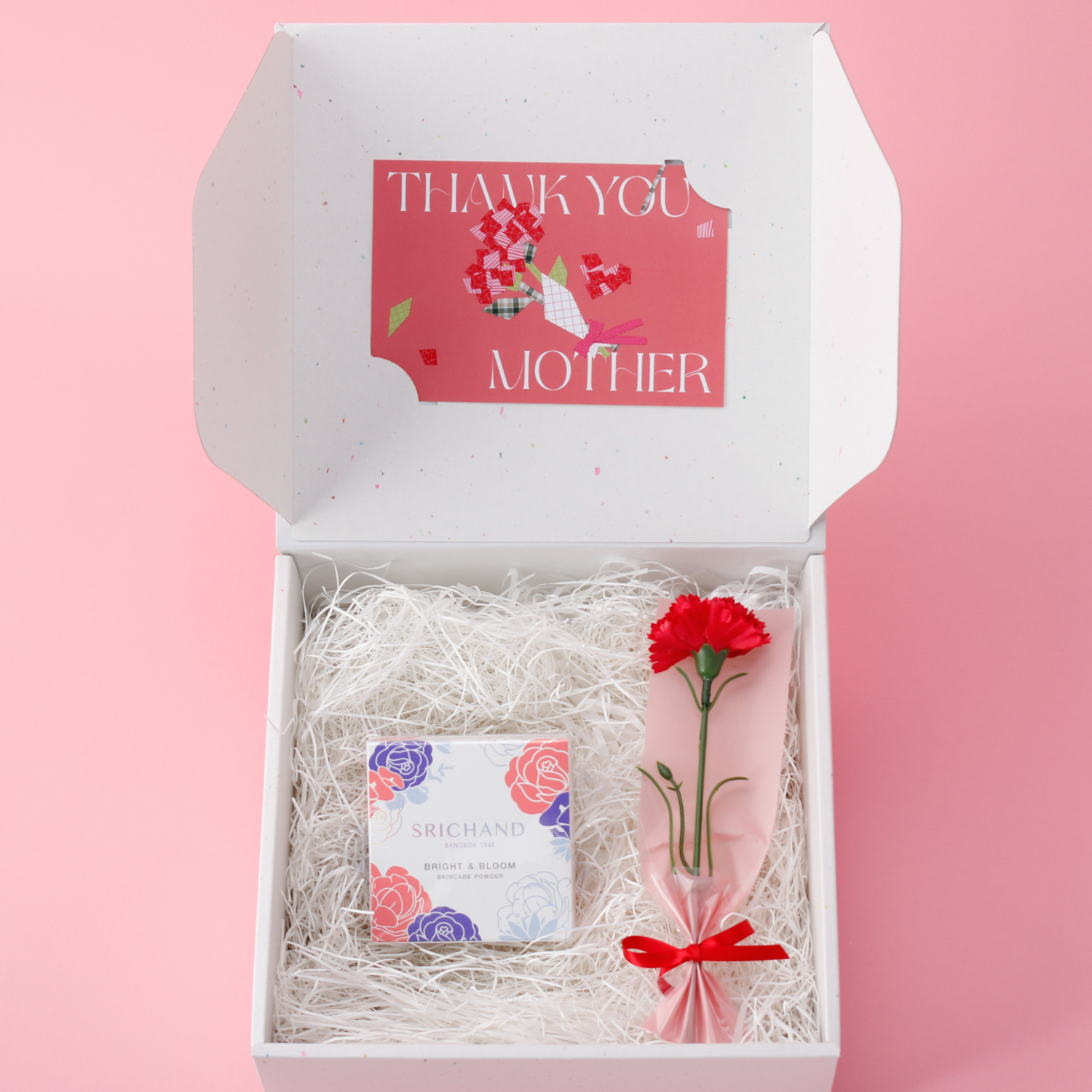 カーネーションと、タイで人気のブランド「SRICHAND(シーチャン)」のフェイスパウダーを専用のギフトBOXに入れてお届けいたします。毎日頑張るお母様へ、ギフトと一緒に日頃の感謝の気持ちを伝えてみませんか。