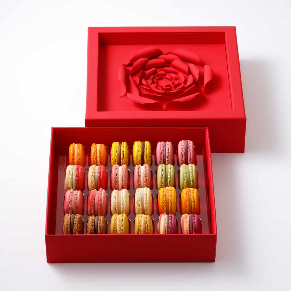 大口注文・法人のお問い合わせはこちら深紅の薔薇をデザインしたボックスに、色鮮やかな12種類のフレーバーを24個詰め合わせた、特別なマカロンのギフトです。ふたを開けた瞬間に広がる宝石のように美しいスイーツは、日頃の感謝を伝える母の日の贈り物にぴったりです。