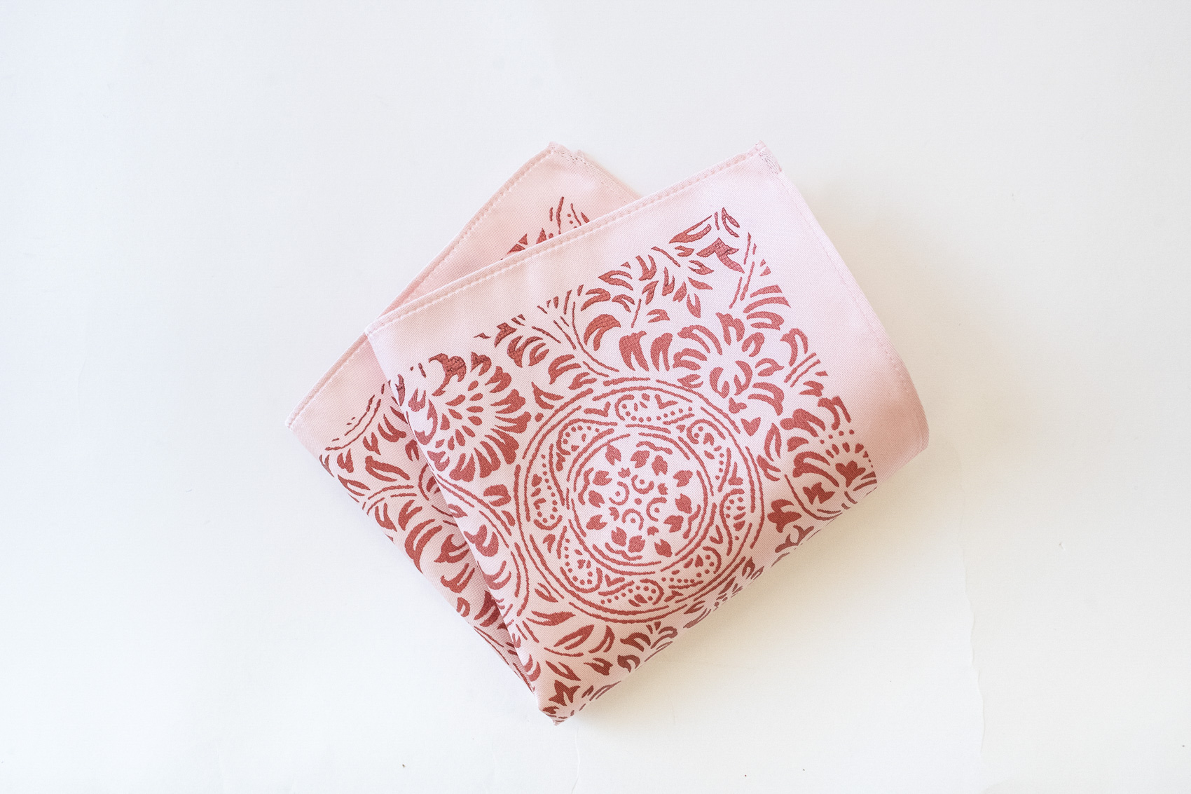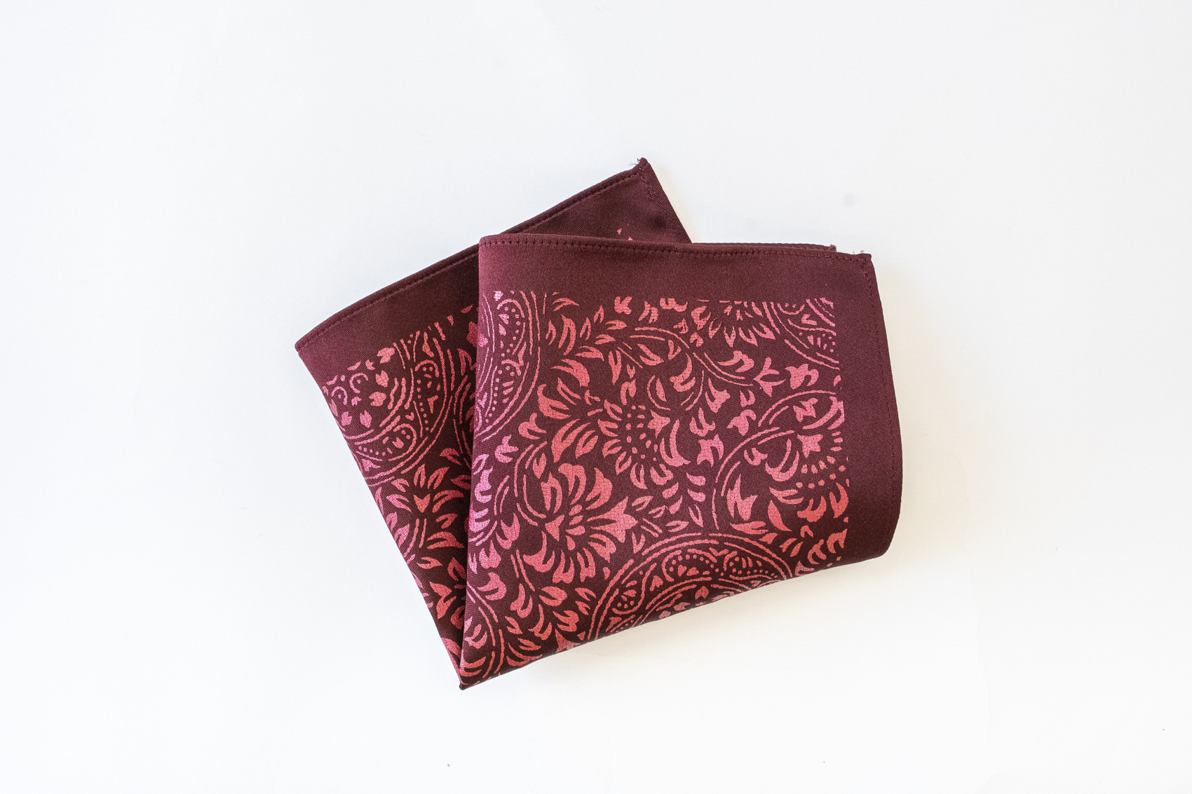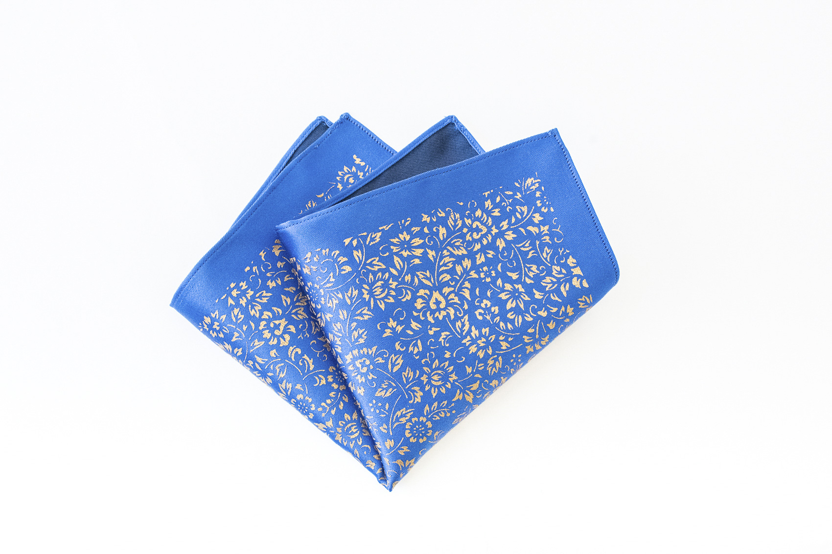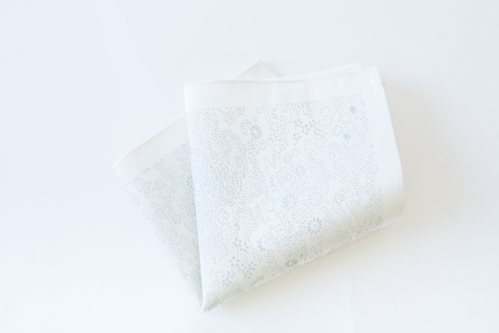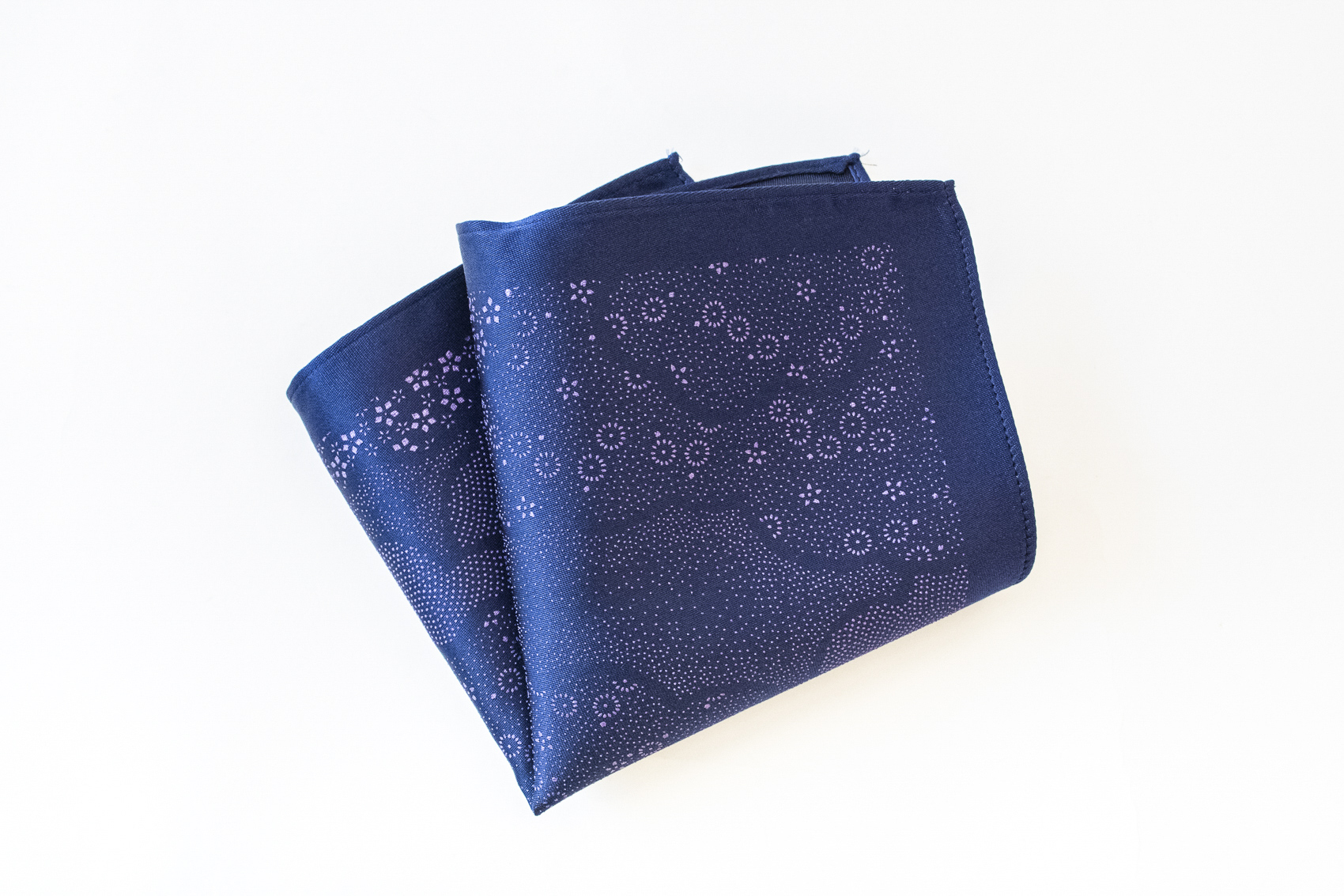 シルク100%のポケットチーフに、伝統技法の練り金を用いて色々な色味に合わせて吟味して仕上げました。