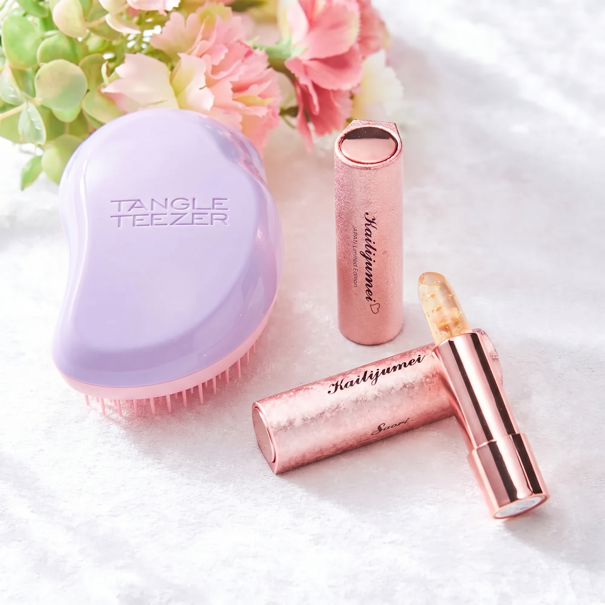 有名なセレブもご愛用中のイギリス生まれの、とかすだけで髪の毛がサラサラになる魔法のブラシ【TANGLE TEEZER】のザ・オリジナルと、 話題のお花リップ「カイリジュメイ ティントフラワーリップ」の豪華なセットです!!日本限定《ピンクゴールドパッケージ》もご用意しています!