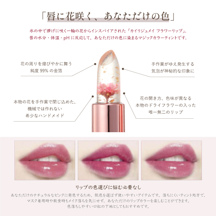 お客様の「色が付かないリップが欲しい」という声から生まれた、フラワーリップのクリアタイプが登場。 pHで色が変化するマジックカラーの既存品とは異なり、ケアに特化した色が付かないフラワーリップです。