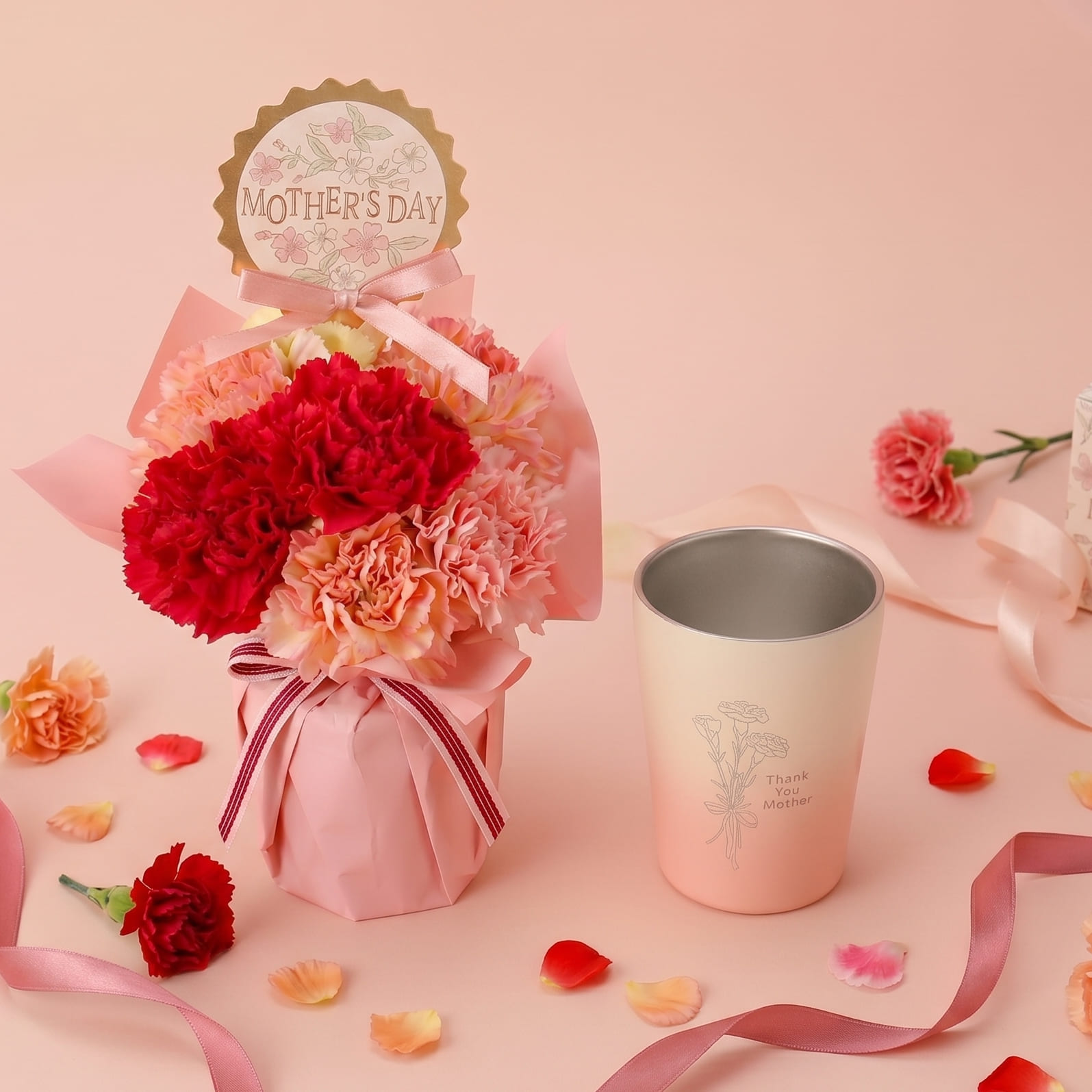 全10種より、お好きな種類を選べる「母の日限定の生花」と、感謝のメッセージとカーネーションのイラストを刻印したサーモタンブラーをセットにしてお届けいたします。普段はなかなか伝えられない「ありがとう」の気持ちを、特別なギフトに込めて贈ってみませんか。