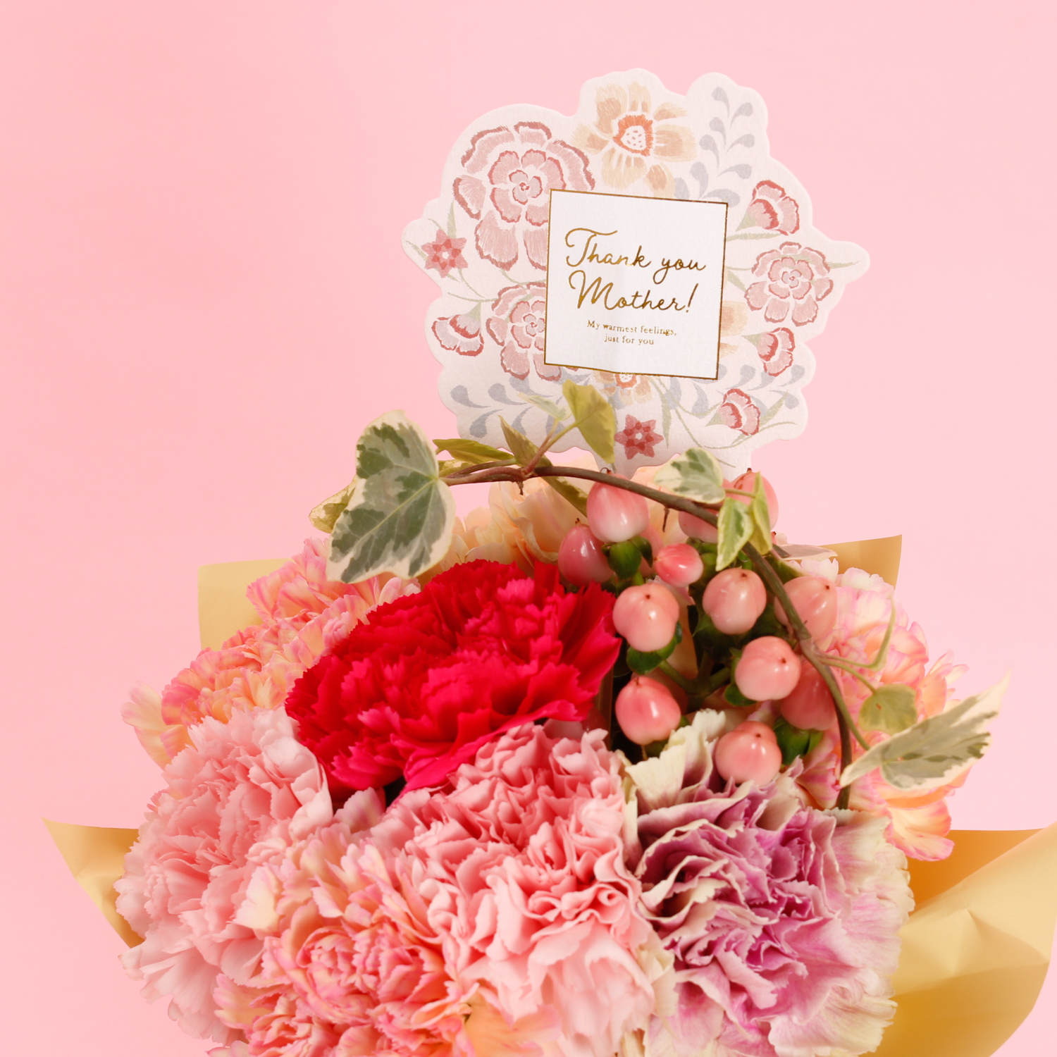 想いが伝わる「MOTHER’S DAY」ピック付き。 華やかな金縁のメッセージピックを添えてお届けします。一目で「ありがとう」の気持ちが伝わる、特別な装いです。