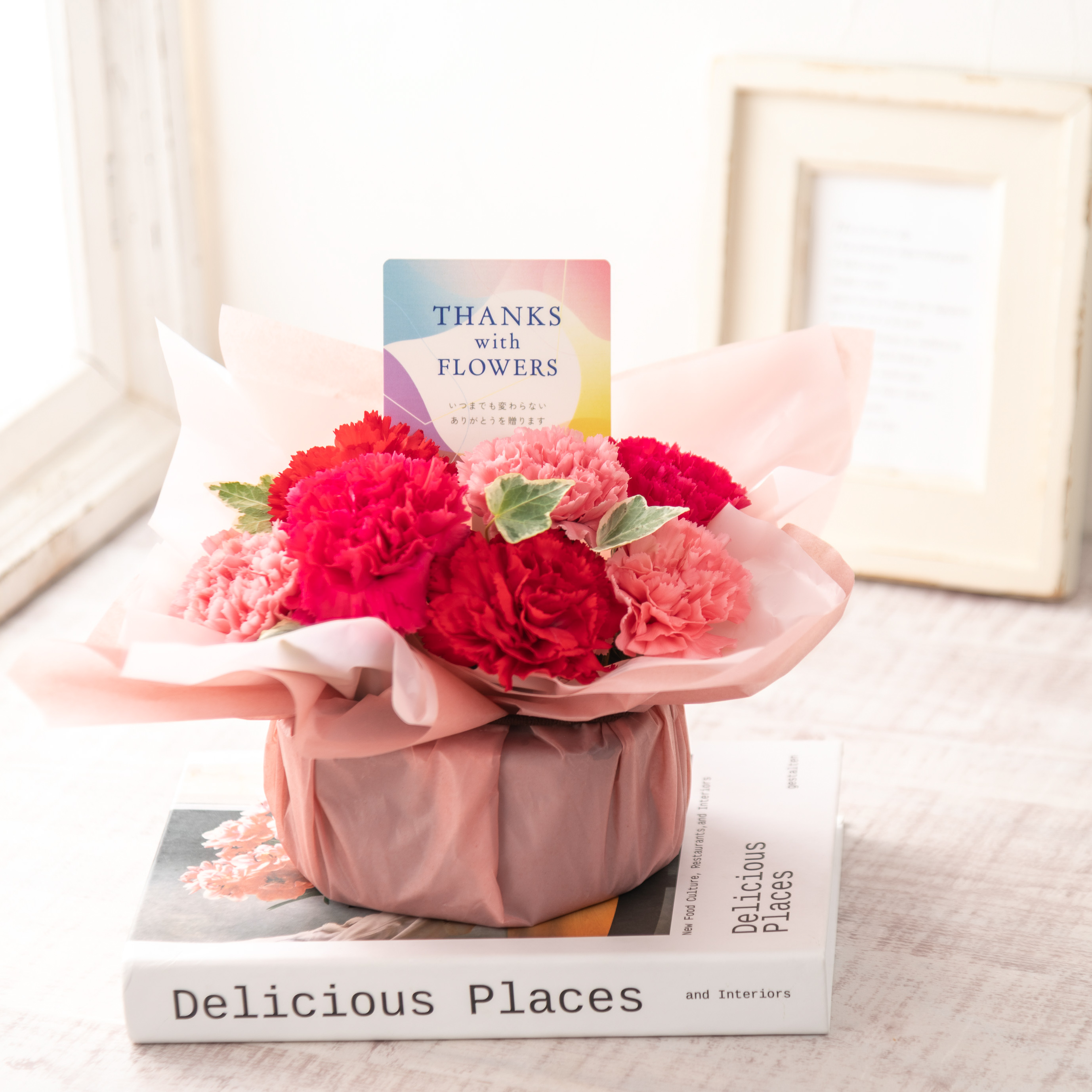 花瓶要らずで贈る方も贈られる方も気軽で、とても人気の高い商品です。 ピンクを基調としたキュートなブーケは、THANSピックがアクセントに。 かわいいテイストがお好みのお母さんへピッタリの商品です。