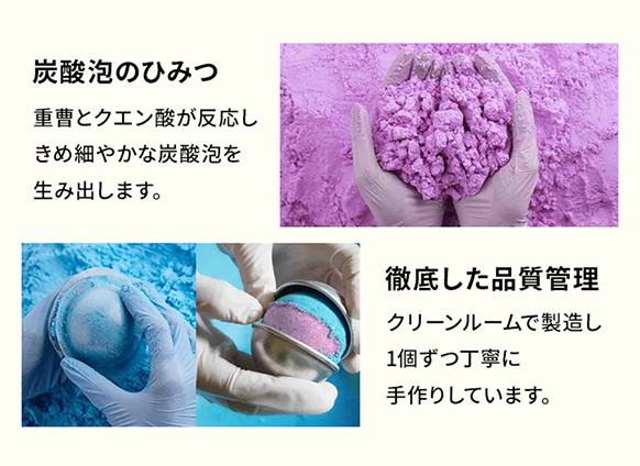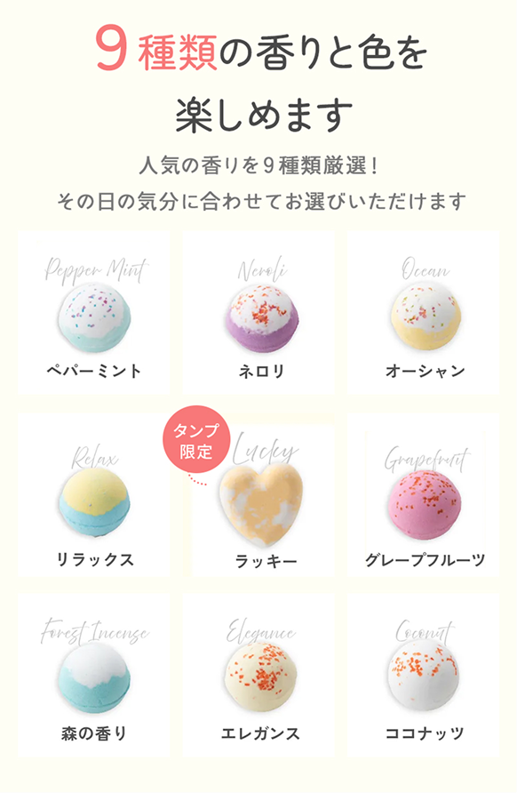 | バスボム | ◾️外装サイズ:幅17.5cm×縦5.6cm×高さ16.5cm ◾️成分:炭酸水素Na、クエン酸、硫酸Na、PEG-8、香料、青1、赤227、黄4、赤104 ◾️バスボム1個あたりの重量:70g ◾️内容量:9個入り(個包装) ◾️同梱物:専用カッター付き |