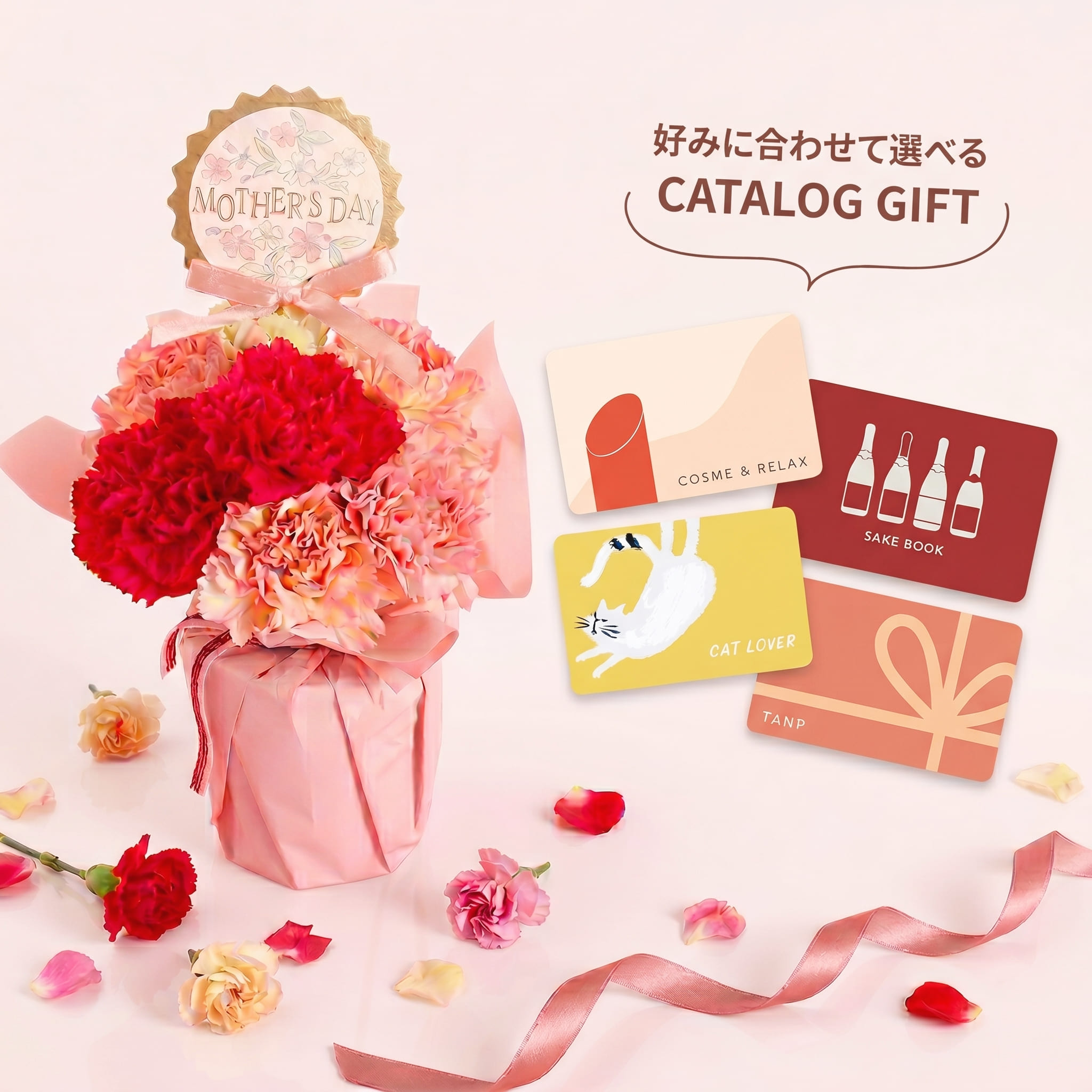 大口注文・法人のお問い合わせはこちら全10種より選べる「母の日限定の生花」と、全8種より選べるタンプオリジナル「カタログギフト」の限定セットをご用意しました。 大切なお母様へ感謝の気持ちを込めた贈り物で、心あたたまるひとときを届けませんか。 <セット内容> ・母の日限定生花 ×1 ・カタログギフト ×1