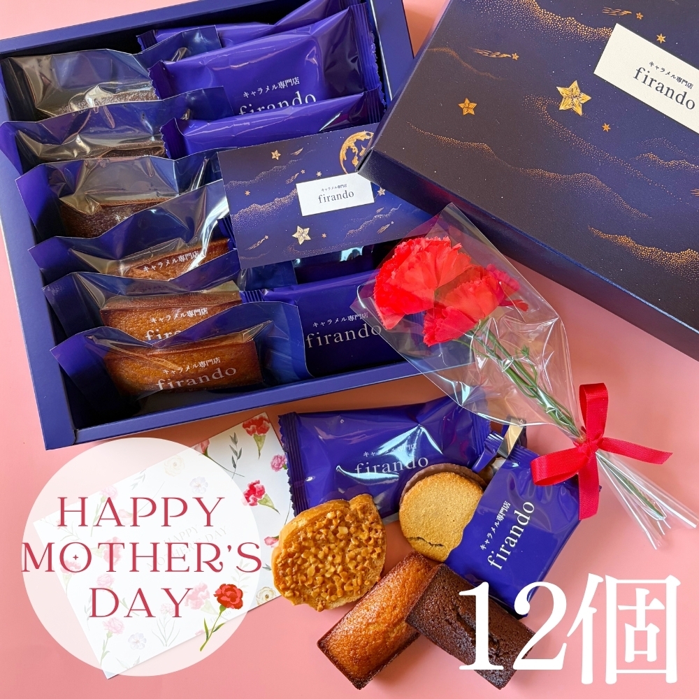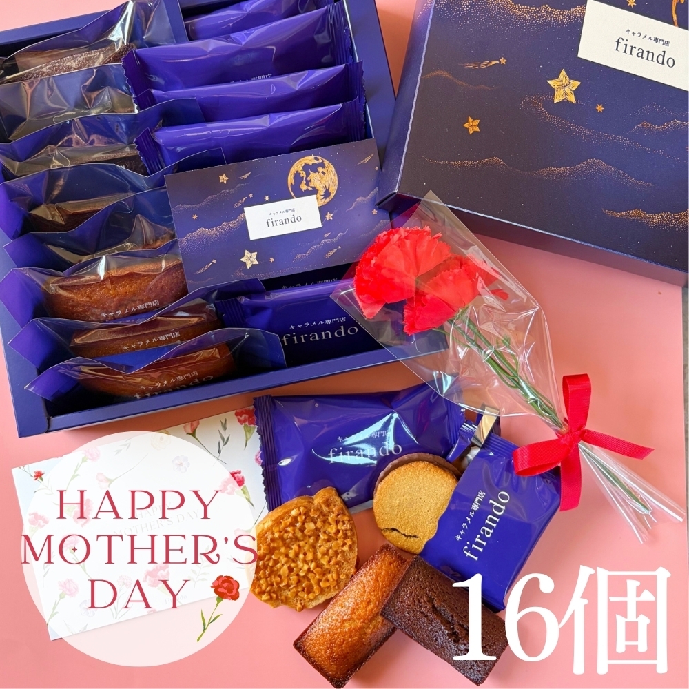 平戸島の満月の塩をアクセントに使用した、キャラメル焼き菓子のアソートボックス。中には、キャラメル好きにはたまらない4種類のスイーツを詰め込みました。母の日限定のラッピングとして、カード・カーネーション(造花)と一緒に、大切にお届けいたします。