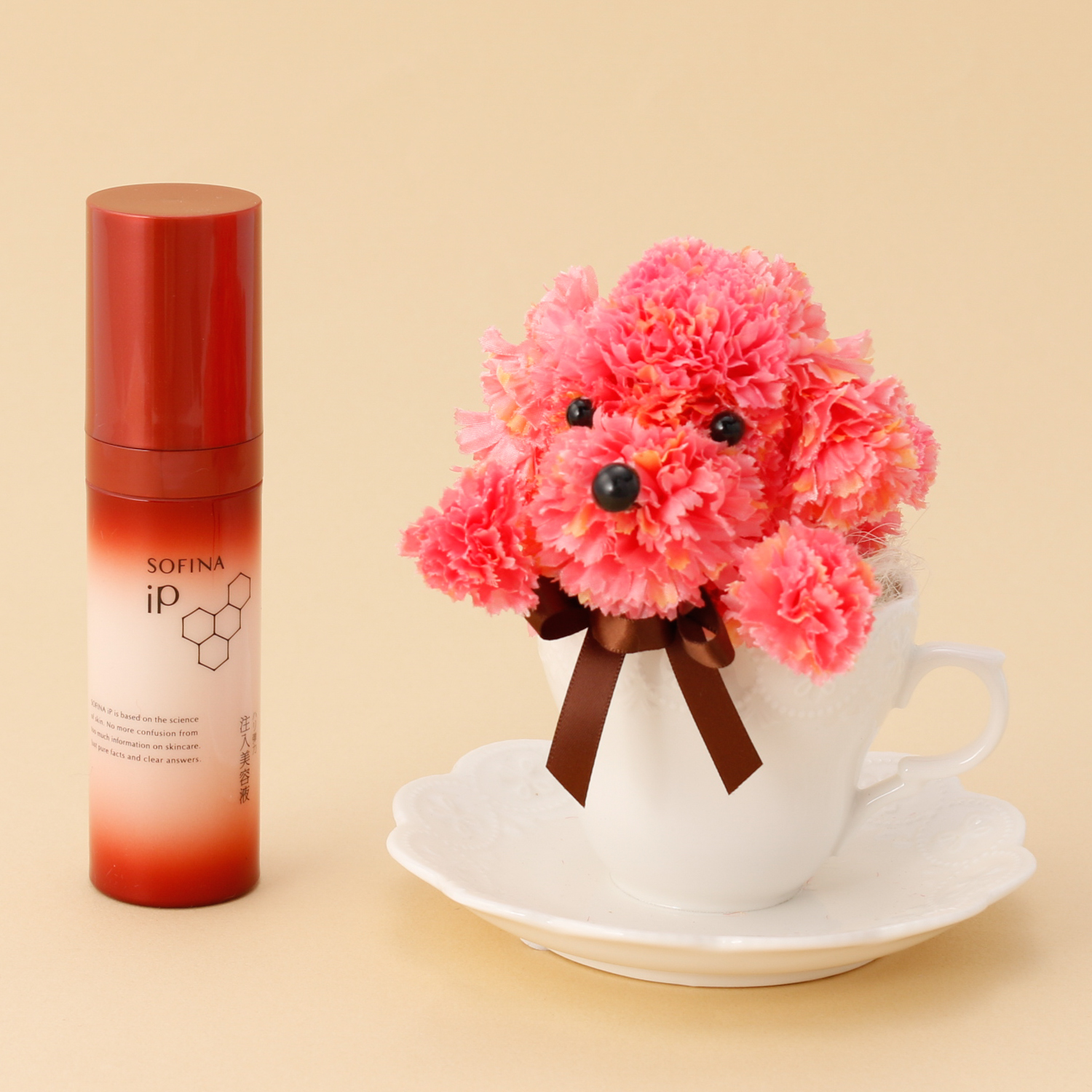ティーカップから覗く愛らしいプードルのアレンジメントと、大人の肌悩みに寄り添う「ハリ弾力注入美容液」のセットです。大切なお母様へ日頃の感謝の気持ちを込めて、母の日限定セットをプレゼントしてみてはいかがでしょうか。