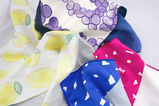 テキスタイルデザイナー 青山 佳世さんのイラストによる、 「フルーツ」をテーマにしたハンカチです。 フルーツシリーズはこのページ以外に、 20cm各サイズ2種、三角形の2種がございます。
