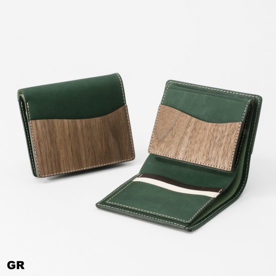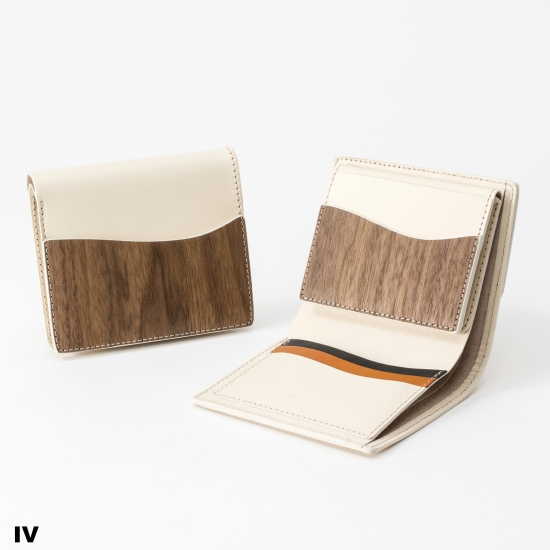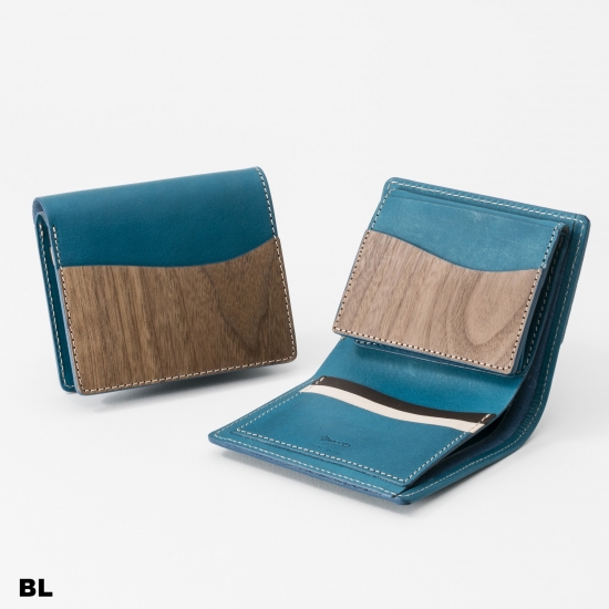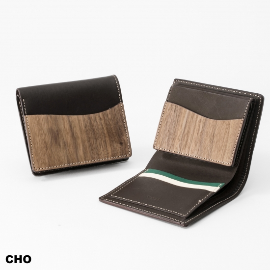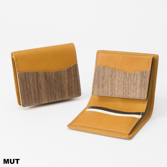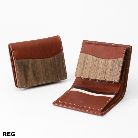 ウッドの外付けポケットが特徴的なデザインの二つ折りウォレットです。外付けポケットは、頻繁に使うカードやICカード類用、駐車場のチケットなどを、一時的に入れるポケットとしても便利です。内側の第2・第3ポケットが配色レザーとなっていて、コインポケットの上蓋パーツもウッドポケット仕様です。