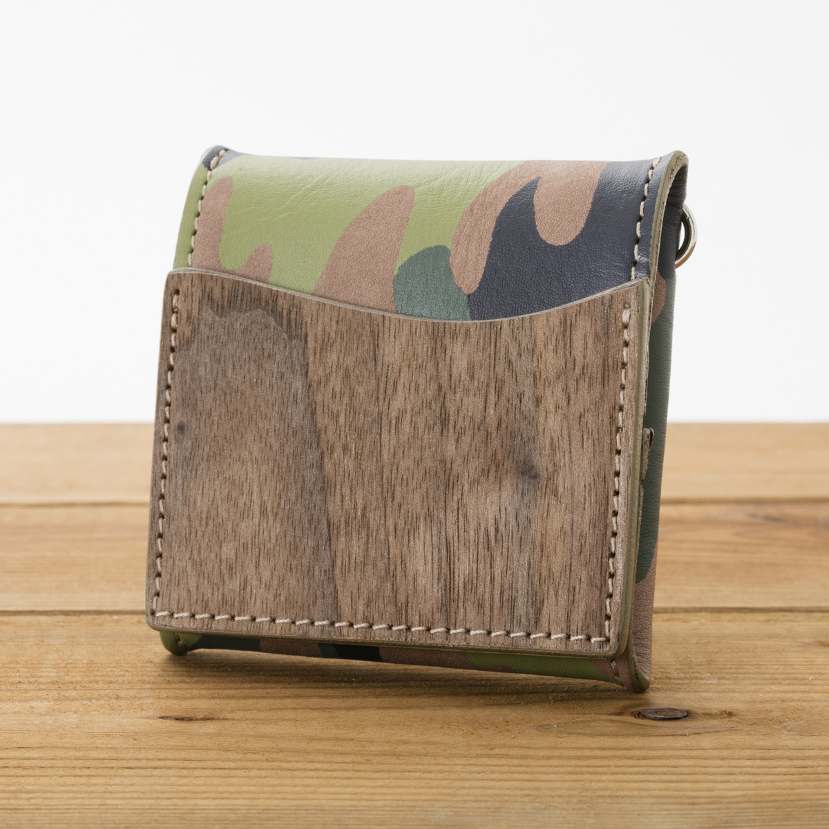 ウッドの外ポケットが付いたシンプルなコインケースです。口が大きく開く構造で、コインが取り出しやすい仕様となっています。手のひらにスッポリと入る大きさで、使うほどに革が柔らかくなりどんどんと良い感じに手に馴染んできます。また、サイド部分には、ストラップ・チャームなどが取り付けられるリングが付いています。ウッドとヌメ革の経年変化を楽しみながら、永くご愛用頂きたいアイテムです。