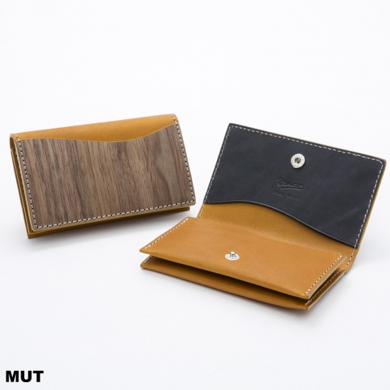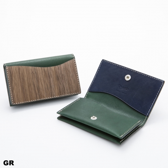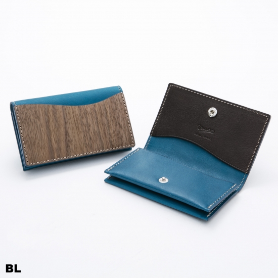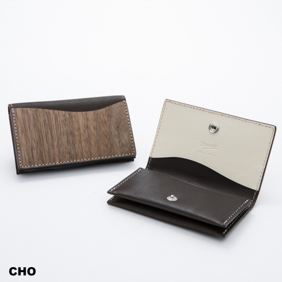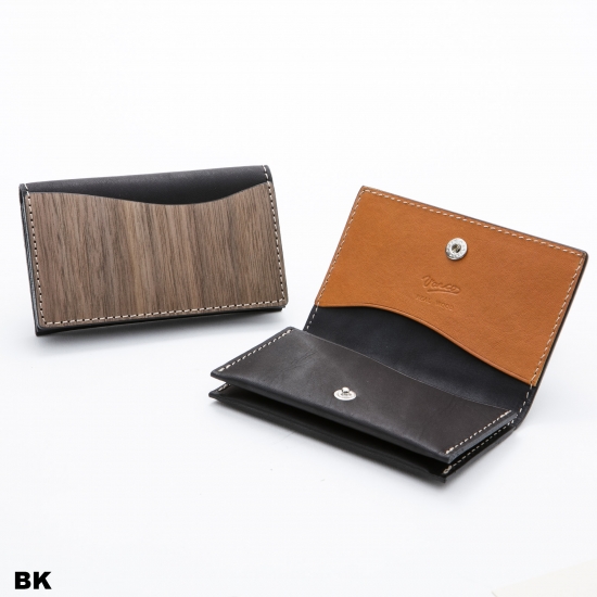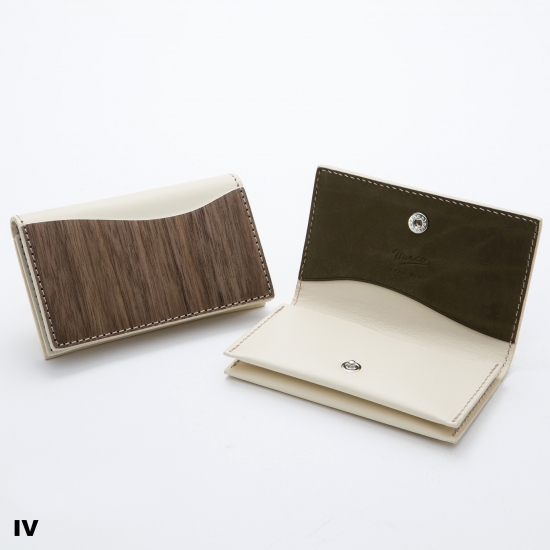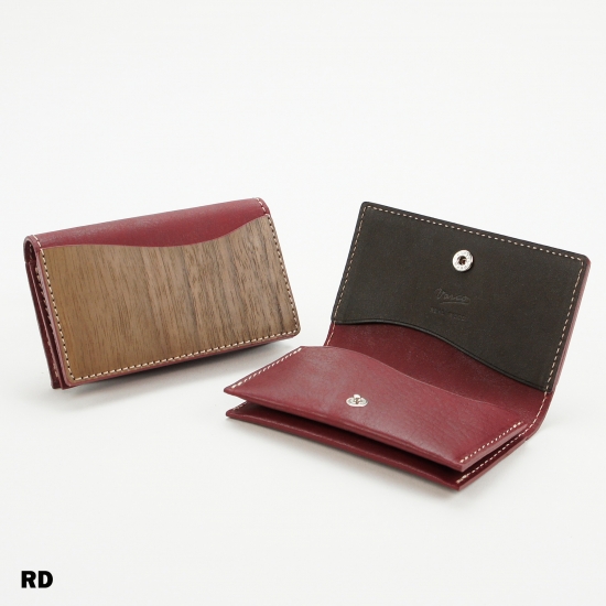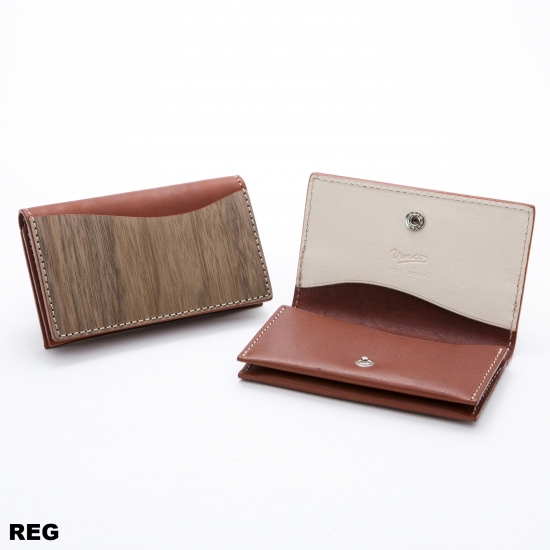 シンプルながら、4つのポケットを持つスリムで機能的なカードケースです。名刺・カード類がスマートに収納できます。内側下の2ポケットには厚手の名刺が約20枚~25枚収納できます。内側上部の1ポケット、ウッドの外ポケットはカード類の収納にお使いいただくと便利です。モダンかつスマートに。ビターなウォルナットのテイストと発色の良い手染めレザーのコンビネーションがちょっと目を引くオリジナリティあふれるデザインカードケースです。