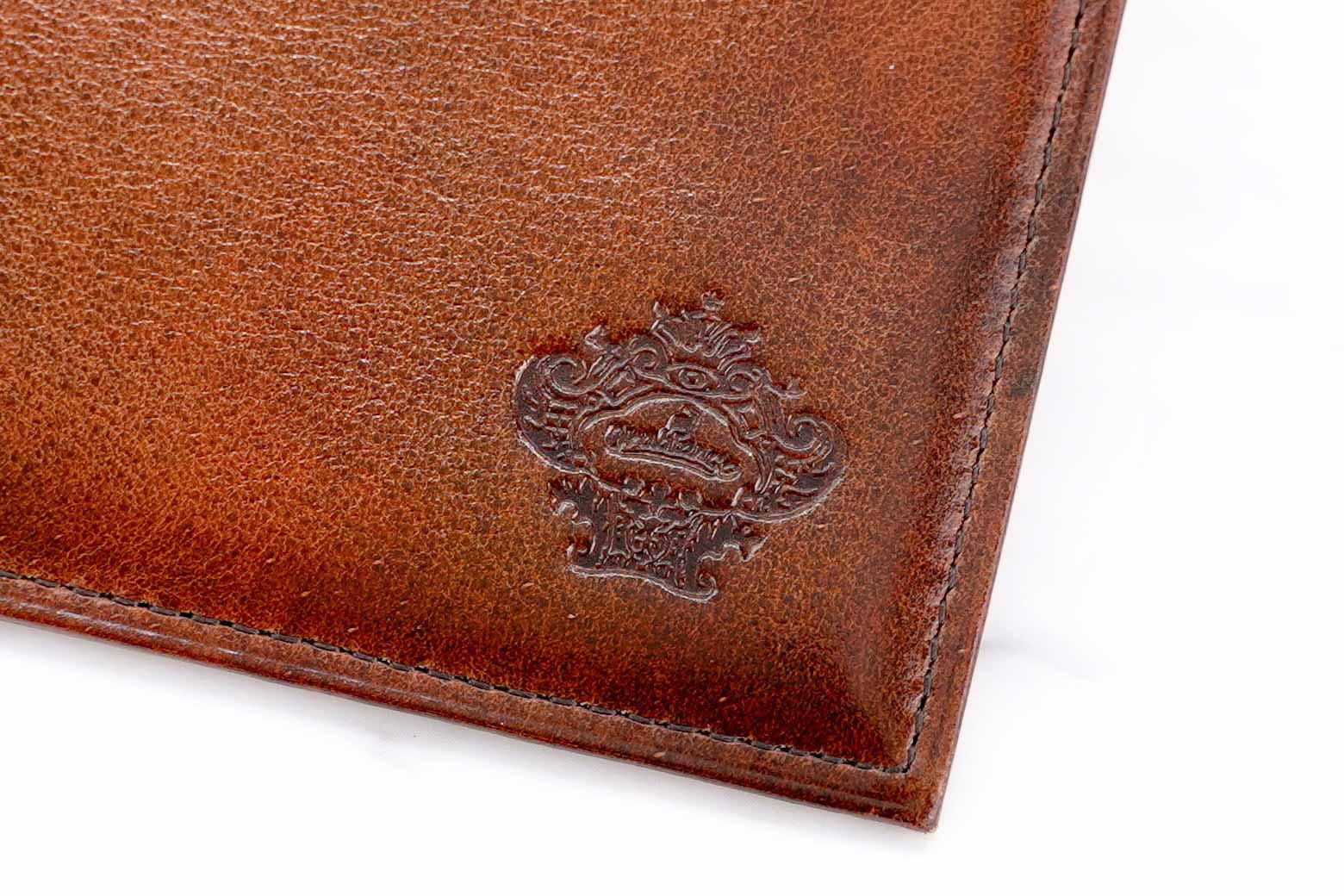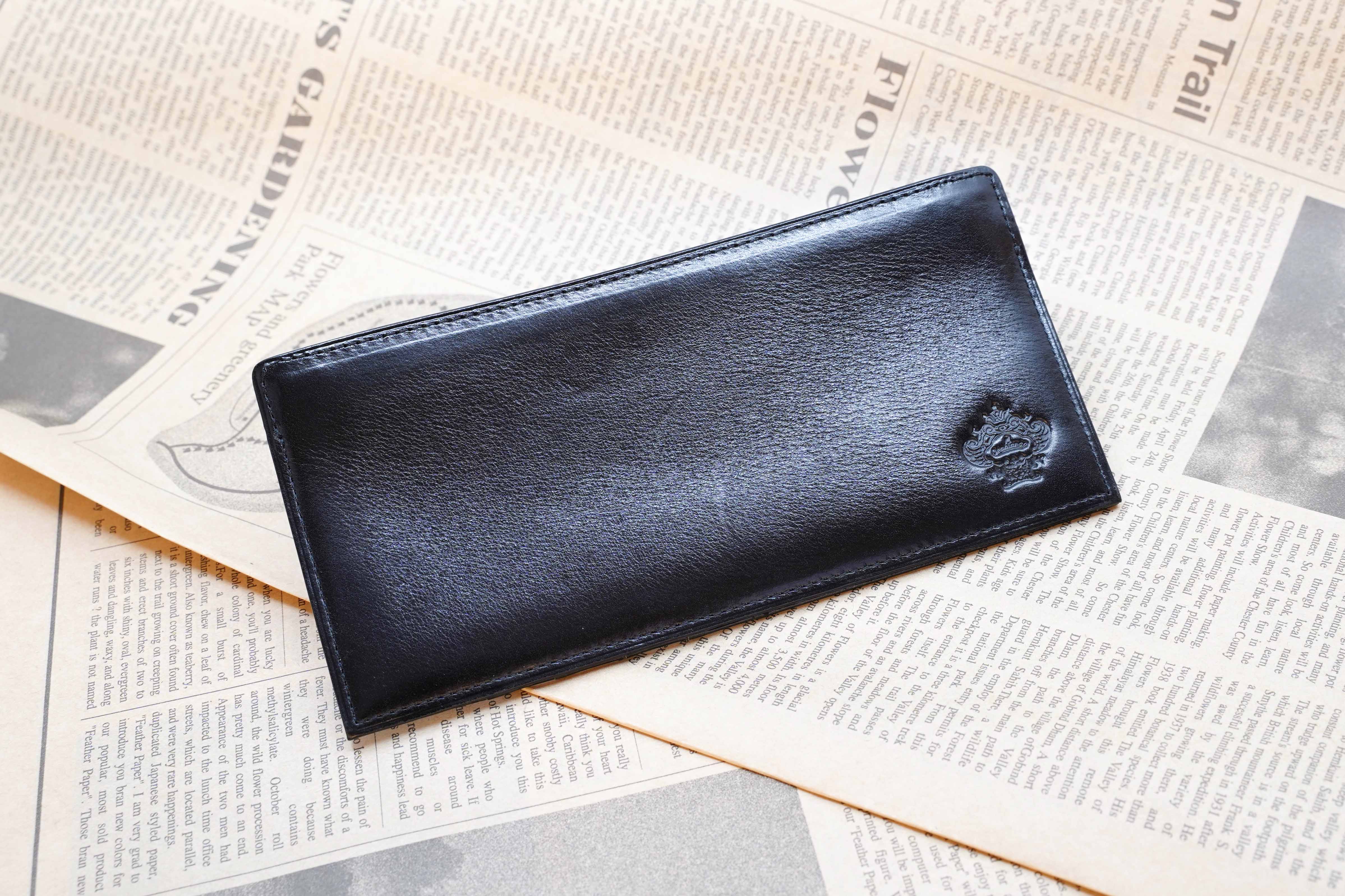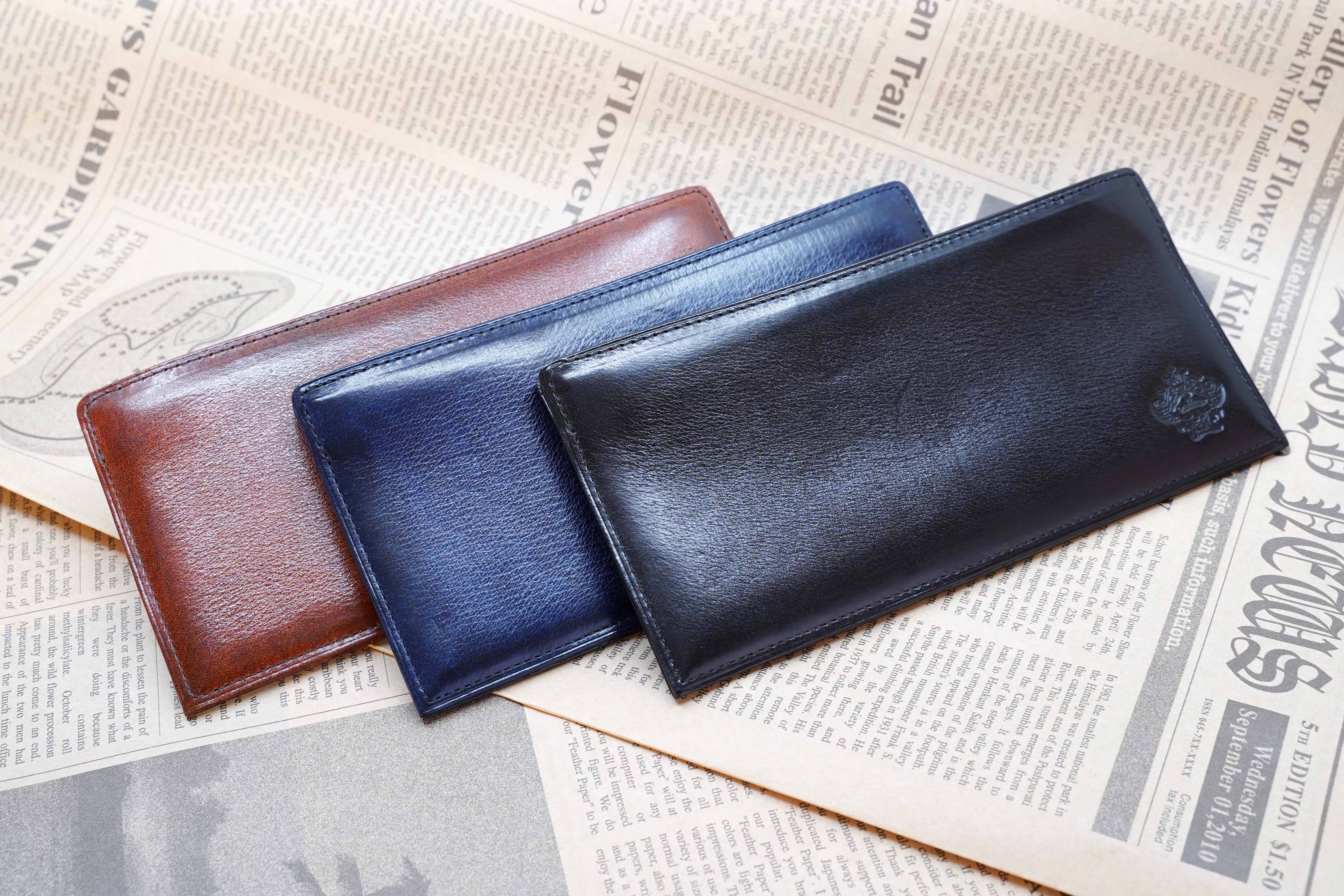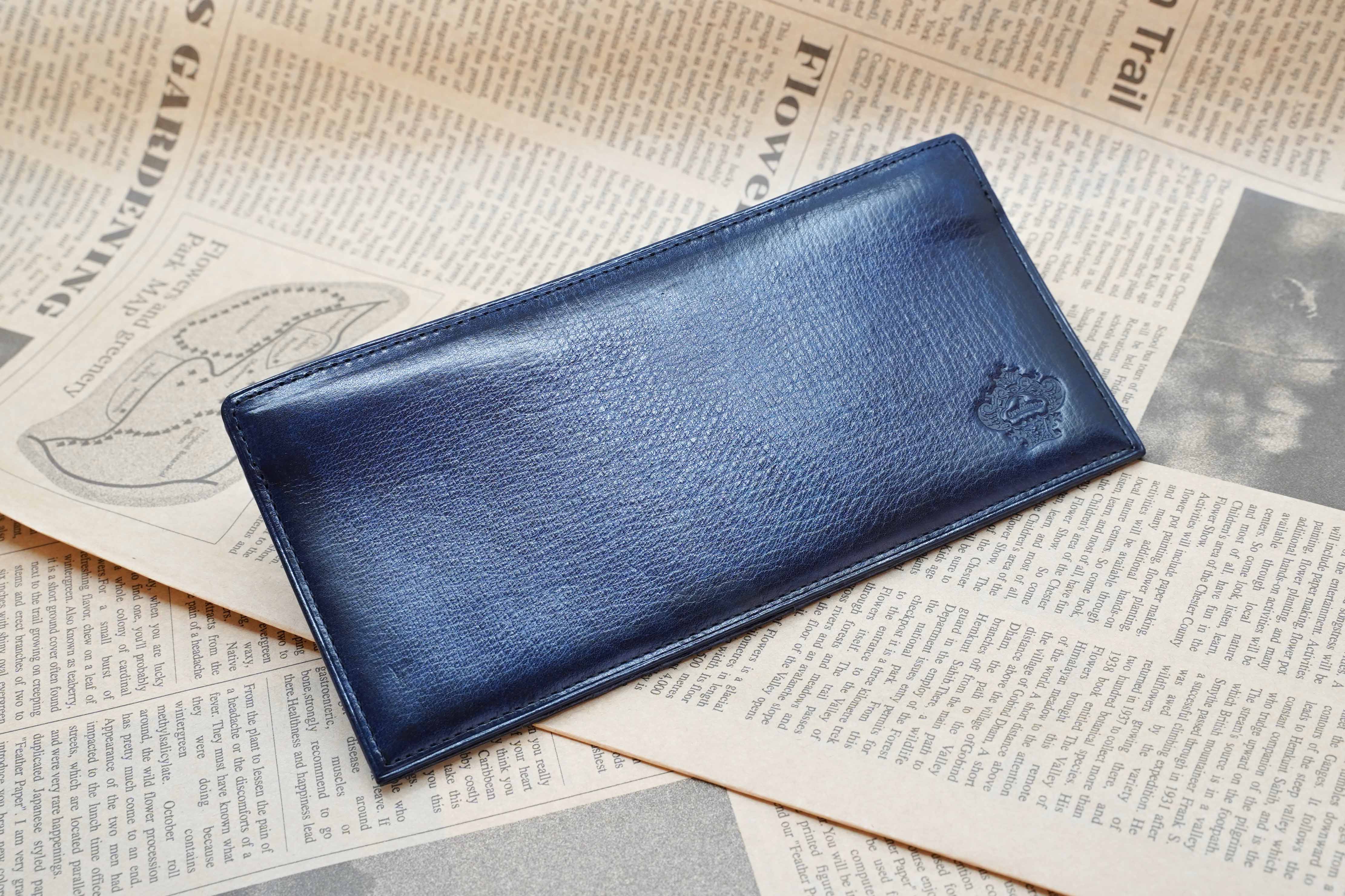 透明感のある仕上がりや、使い込まれたような独特な色ムラのを独自の技法で作り上げました。その上、革職人による手もみ加工を加えることによりキップ素材ならではの細かなシボがたち、ソリッドワックスが染料と共に動き重ねた色目を浮き立たせます。最終仕上げで染料を入れて磨いたコバのカラートーンが輪郭をすっきりとエレガントに、スーツから取り出す手元に魅力を与えるアイテムです。