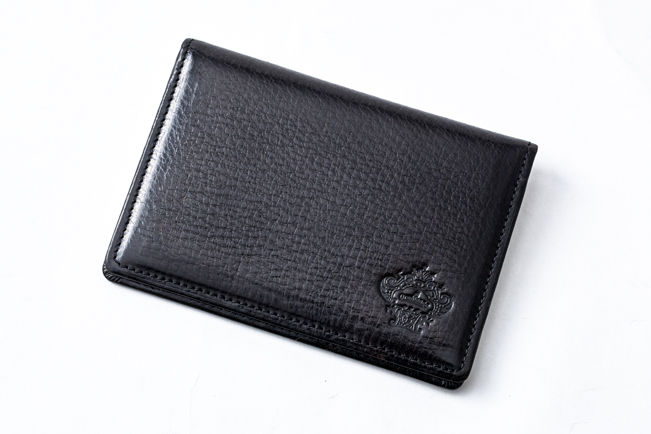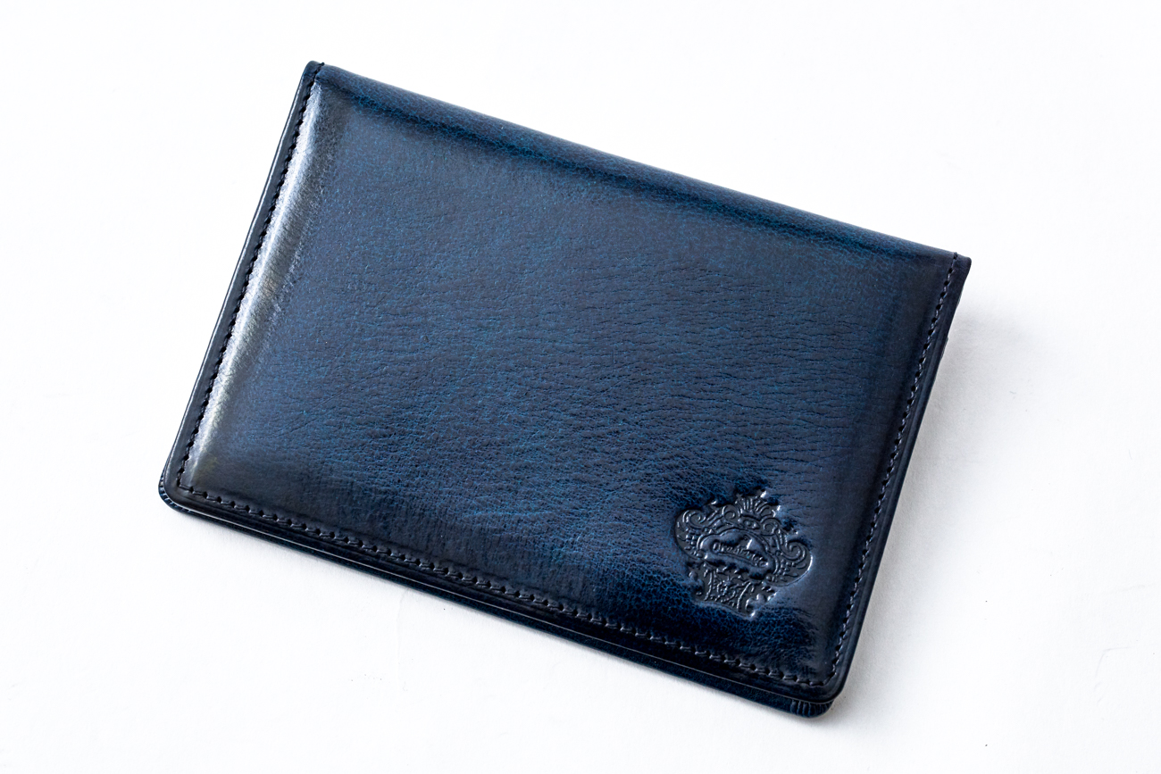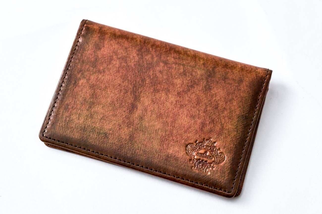 透明感のある仕上がりや、使い込まれたような独特な色ムラのを独自の技法で作り上げました。その上、革職人による手もみ加工を加えることによりキップ素材ならではの細かなシボがたち、ソリッドワックスが染料と共に動き重ねた色目を浮き立たせます。最終仕上げで染料を入れて磨いたコバのカラートーンが輪郭をすっきりとエレガントに、スーツから取り出す手元に魅力を与えるアイテムです。