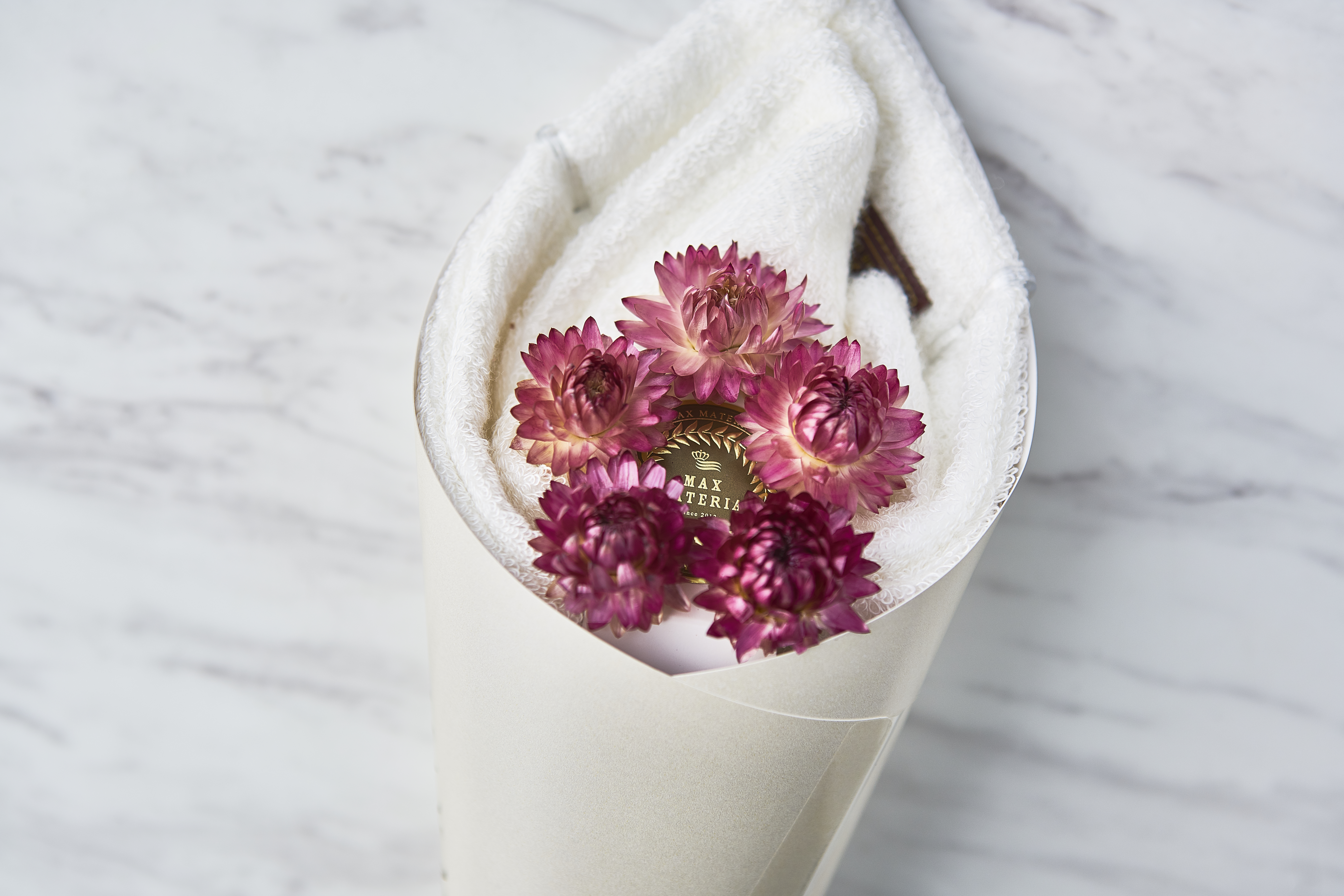 タオルに包まれている天然のドライフラワーは『エバーラスティング』。 その名の通り、乾燥させても花びらの色を変えず、永遠に咲き誇るような美しさが特徴です。 エバーラスティングの花言葉は『永遠の思い出、不滅の愛、いつまでも続く幸せ』。 生花のように花瓶にさして水を上げる必要がなく、生花よりも長持ちします。