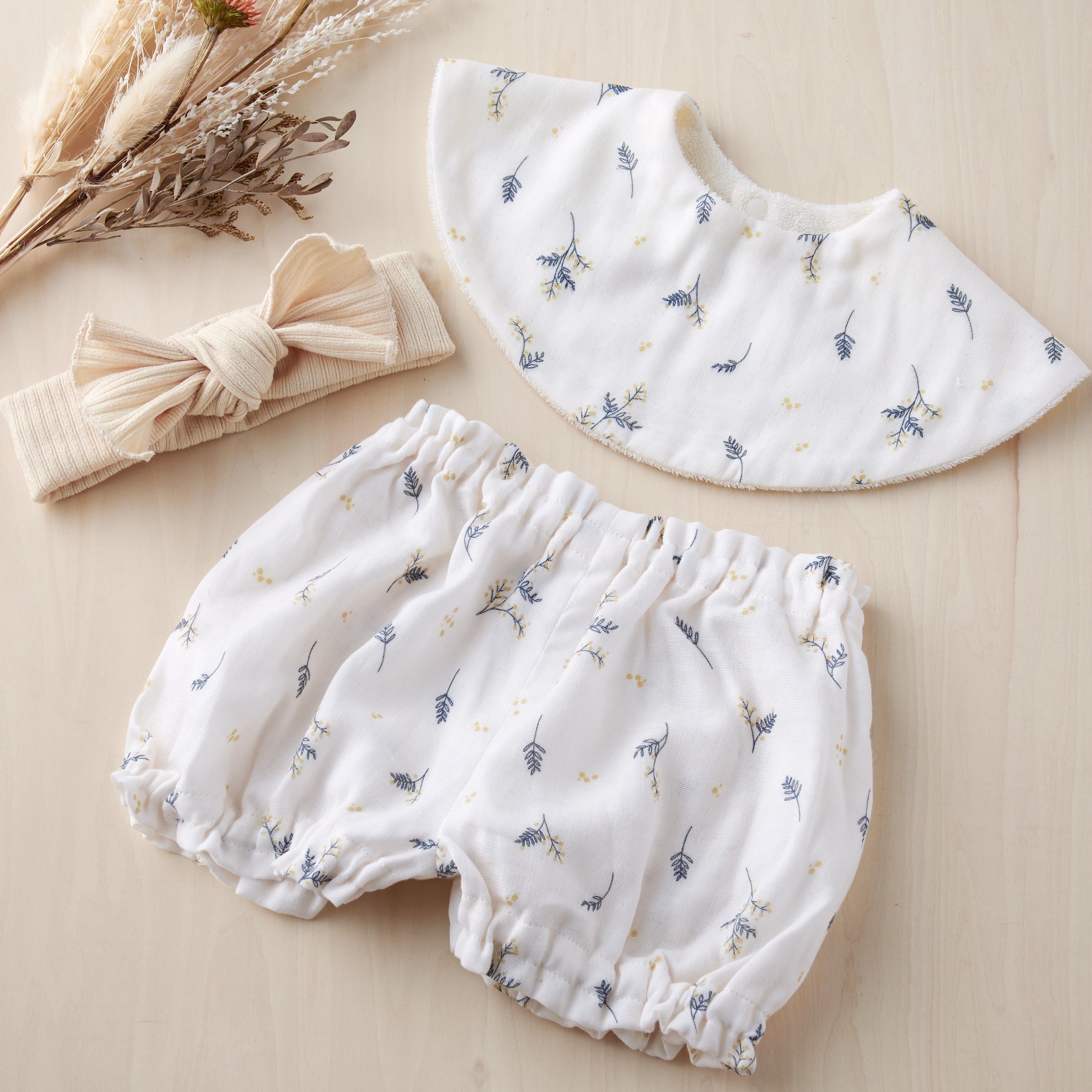 大口注文・法人のお問い合わせはこちらお揃いの「Babyヘアバンド」「スタイ」「ブルマ」の3点がセットになった、出産祝いにおすすめのギフトセットです。 ダブルガーゼ素材で、赤ちゃんの肌に優し素材を使用しています。