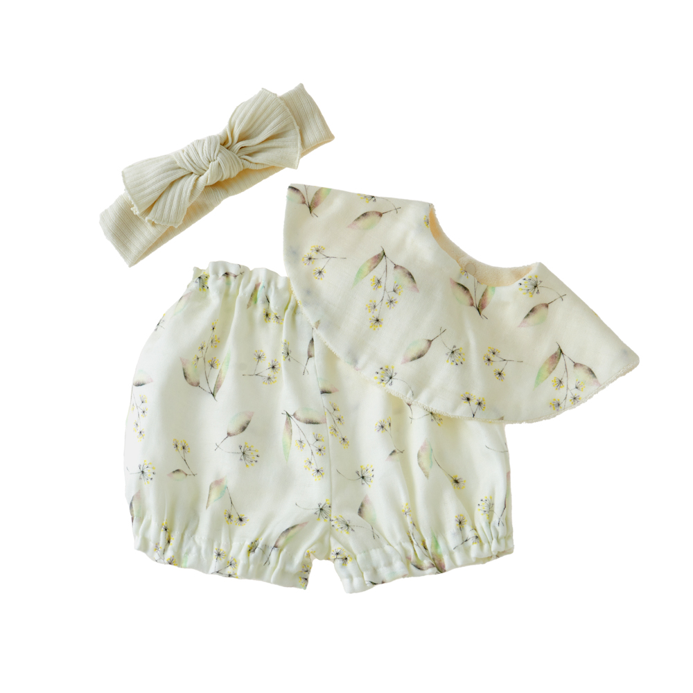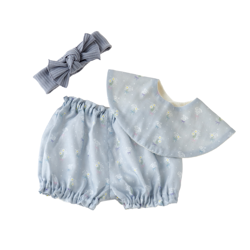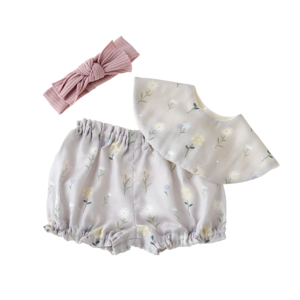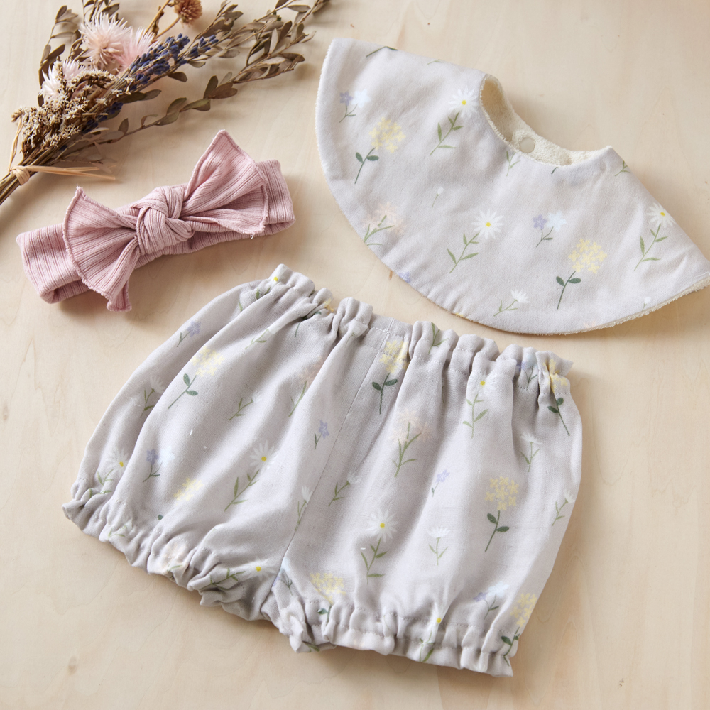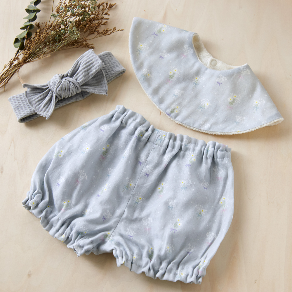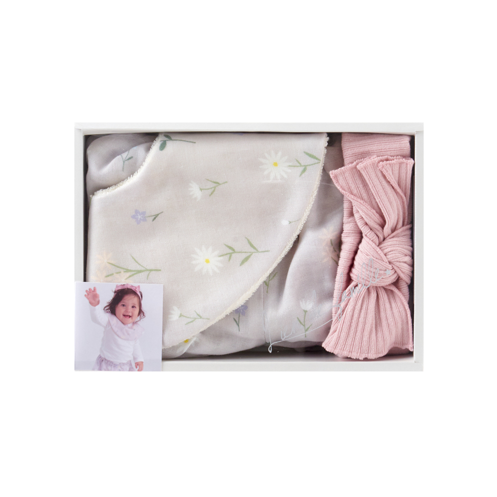 ヘアバンド・スタイ・ブルマの3点がセットになった出産祝いにおススメの「花言葉ギフトセット」です。