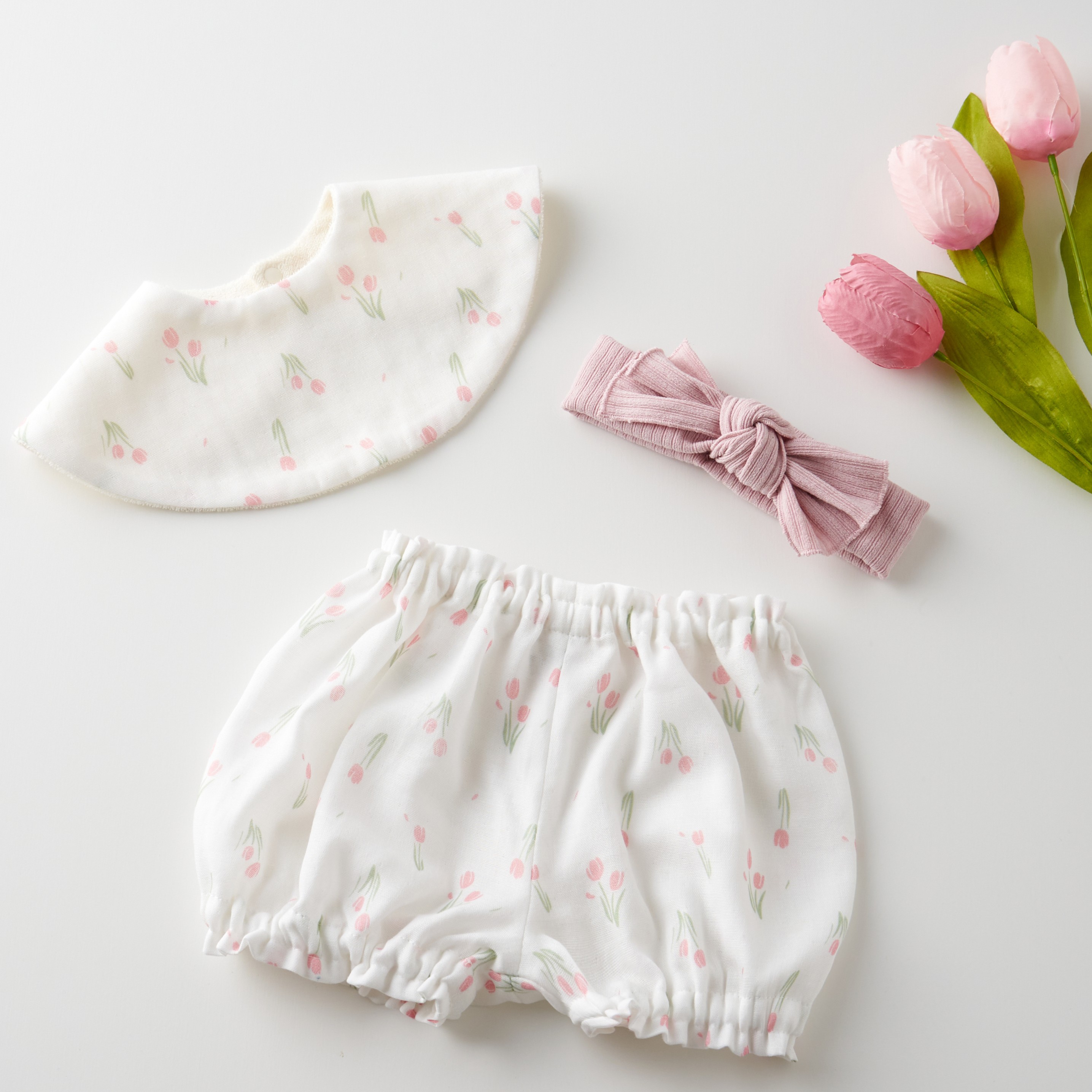 女の子ベビーに人気のガーゼスタイ、ヘアバンド、ブルマのセットです。 このセットを付けるだけで可愛らしい華やかなスタイルが完成します。 普段使いはもちろん、お出かけの時のおしゃれ着としても活躍します! 特別なセットをプレゼントしてみてはいかがでしょうか。
