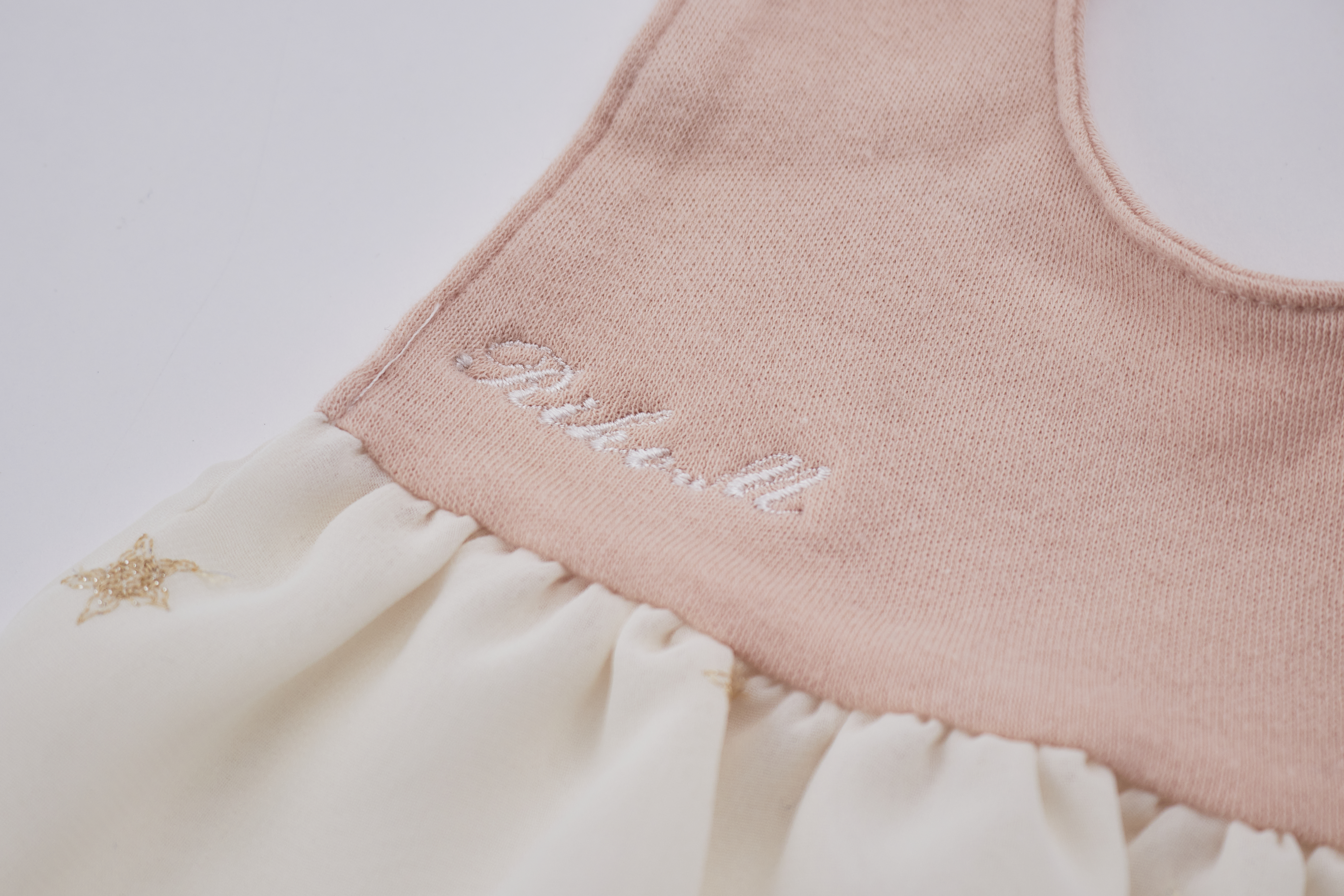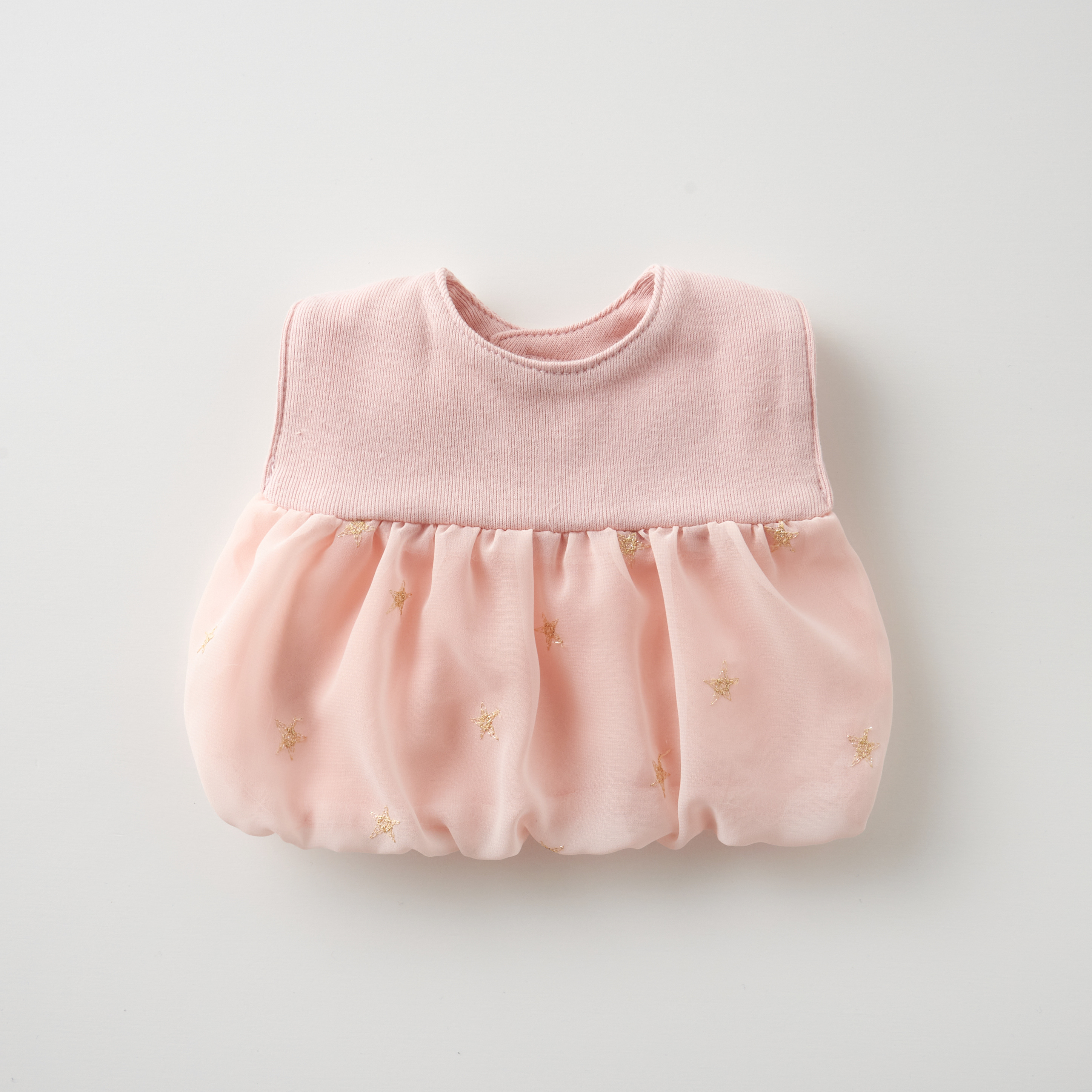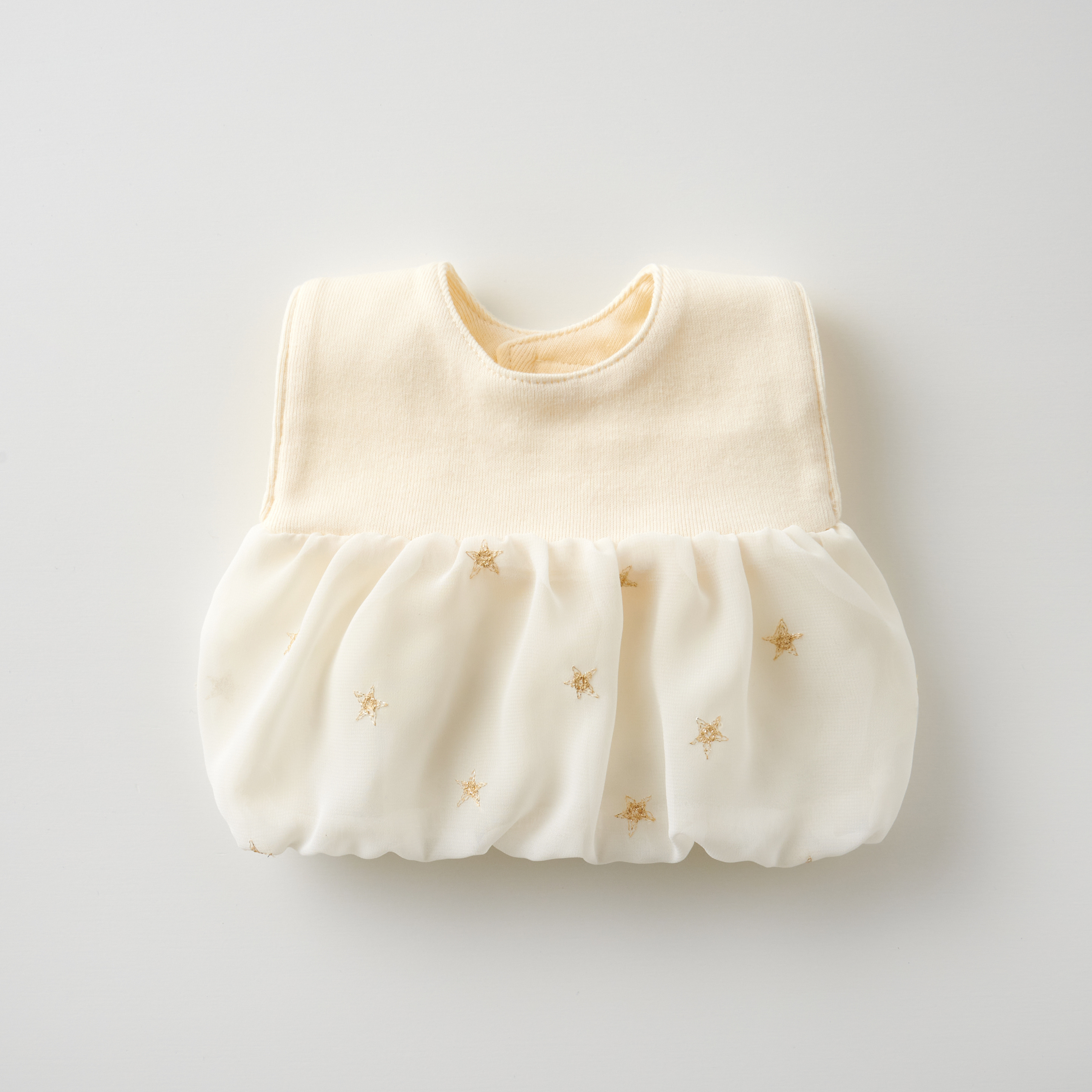 さっと着せるだけでドレスアップできるワンピースのような可愛い「ラメスタースタイ」。ふわっと広がったシフォンの生地にラメ糸で刺繍された星がキラッと光って素敵です。